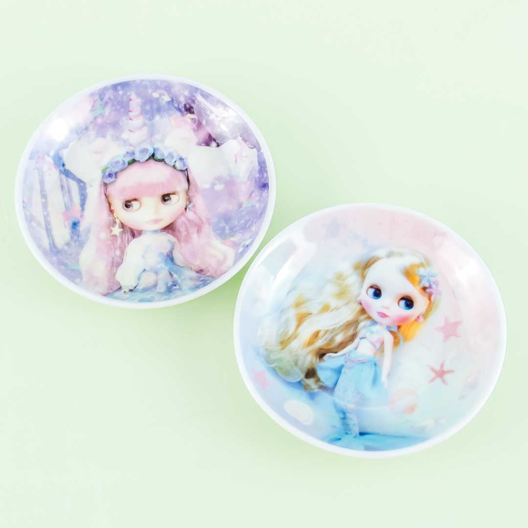 Eat your meals using this super cute set of dishes! These plates are illustrated with highly-collectible Blythe dolls in magical settings. One Blythe doll is dressed as a mermaid while the other is wandering an enchanted forest!
