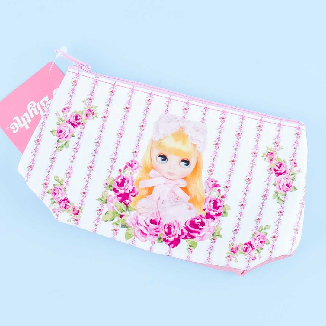 • A kawaii long pouch illustrated with a Blythe doll surrounded by roses