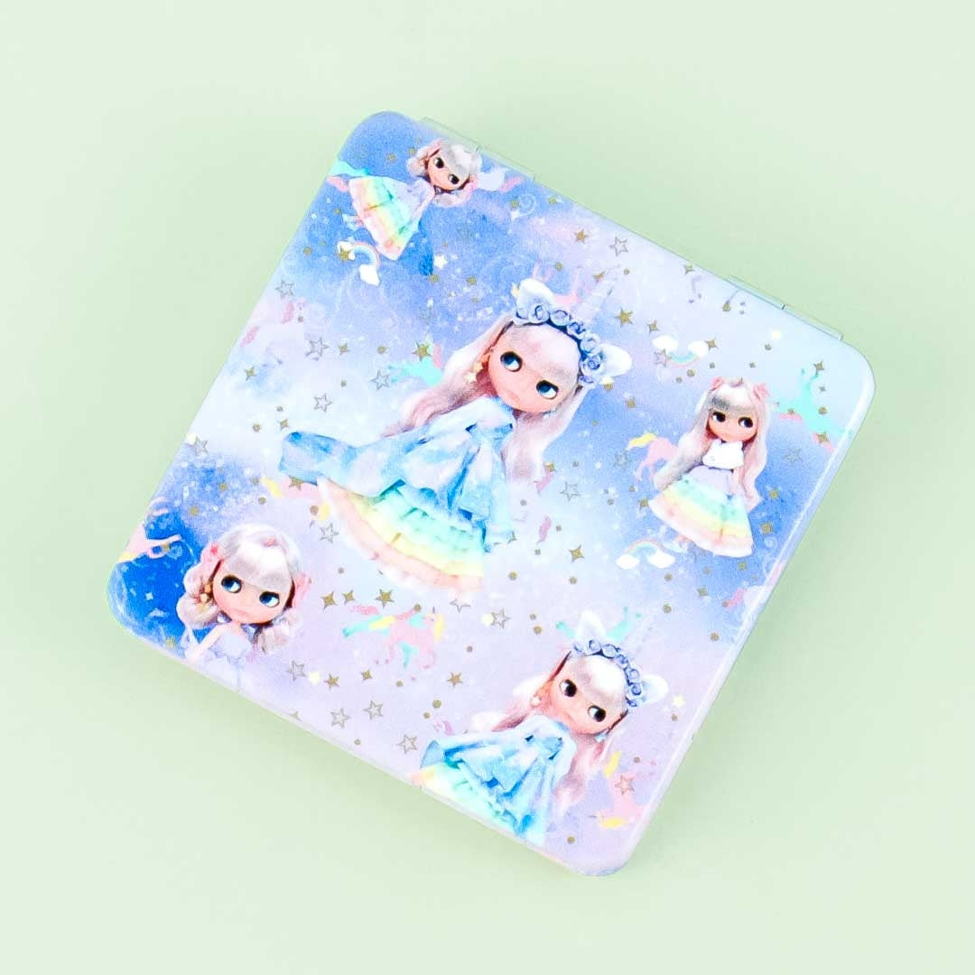 Do a quick retouch using this kawaii dual mirror compact! One side has a flat mirror so you can see your whole face while the other has a magnifying convex mirror for a close-up view. It has an illustration of a Blythe doll dressed as a unicorn maiden.