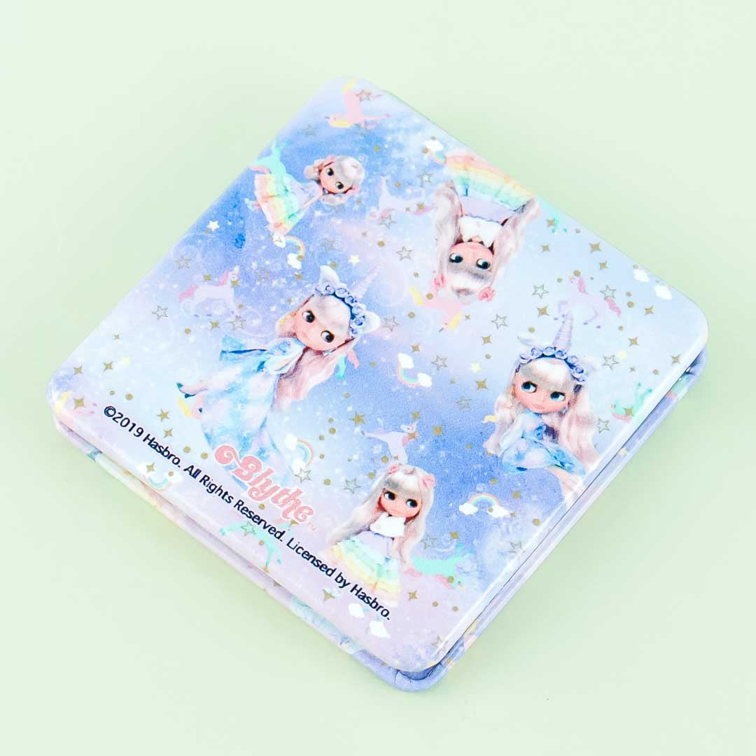 A kawaii dual compact mirror featuring a Blythe doll dressed as a unicorn maiden