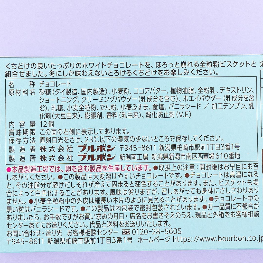 Allow yourself to indulge in these sweet treats during tea time! Each individually wrapped whole wheat biscuit is coated with snow white-colored chocolate.