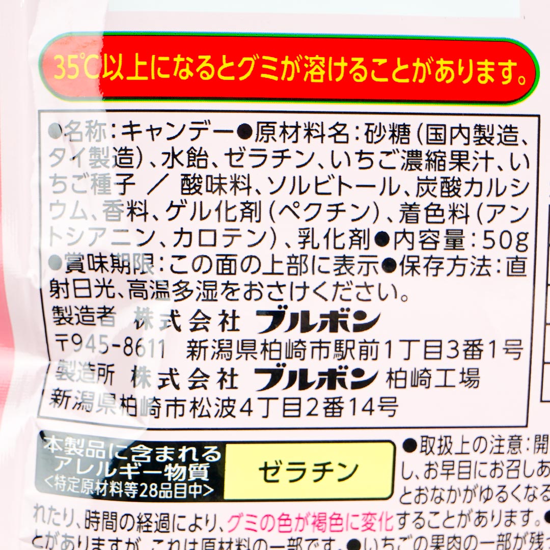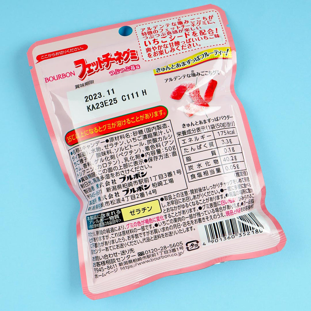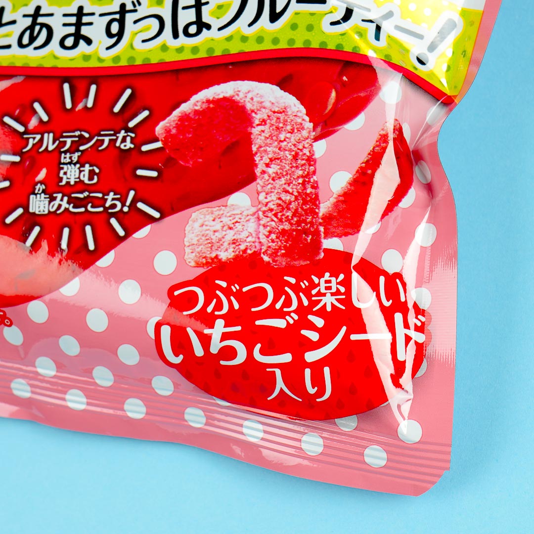 Enjoy the sweet and sour taste of this fettuccine-shaped gummy candy! It's made with strawberry juice and seeds to recreate the fruit's flavor and grainy texture.
