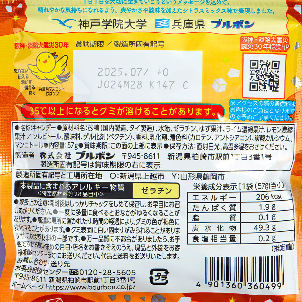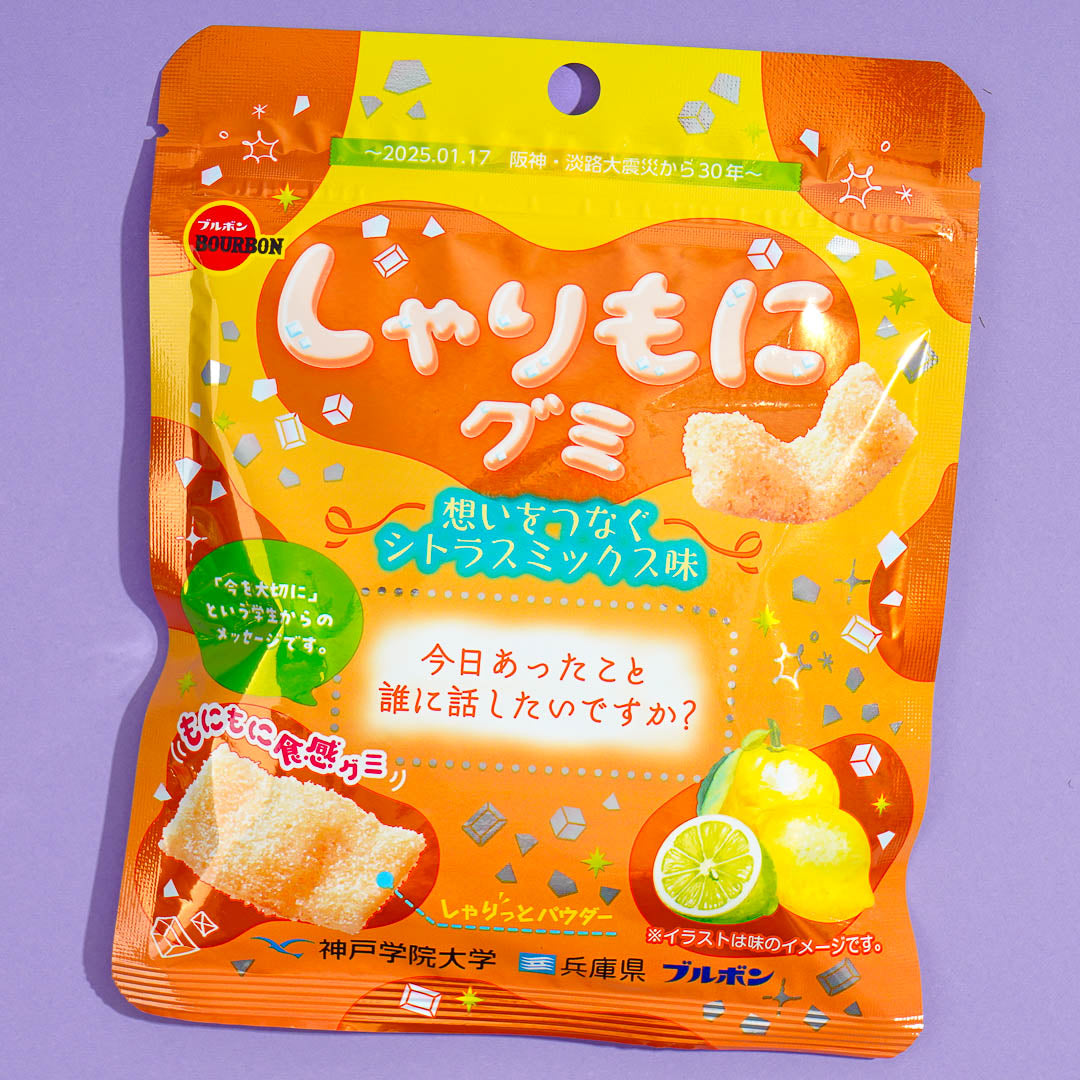 Have fun chewing on these sweet and tart citrus-flavored gummies. They were made in collaboration with Kobe Gakuen University in the Hyogo Prefecture. You'll find a sweet Japanese message from the students of the university on the packaging saying "We can't take ordinary days for granted. Let's live each and every day to the fullest."