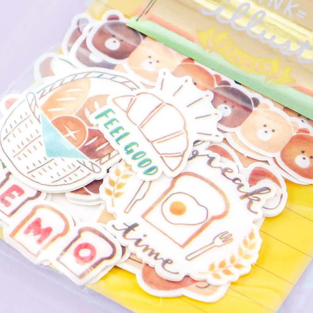A pack of kawaii stickers with prints of cute bears and different bread