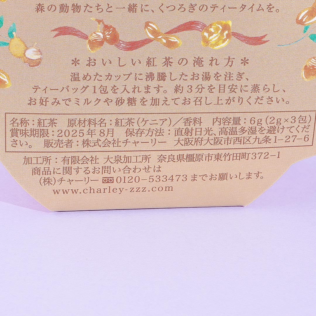 Add this pack of tetra-shaped tea bags to your cupboard! It's illustrated with cute forest animals having a tea party. Each tea bag in the pack makes for a delicious cup of marron and maple-flavored black tea.
