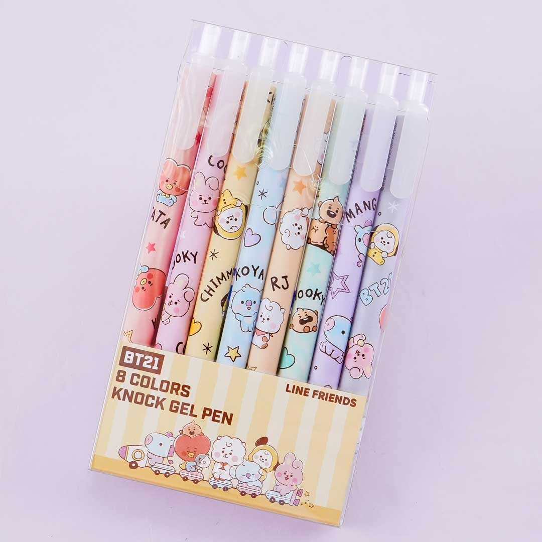 Have fun drawing with this super cute set of retractable gel pens illustrated with characters from BT21! It has eight different colors that you can use.