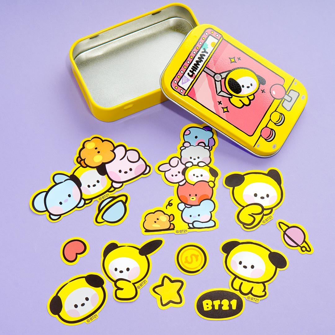 The sticker set includes adorable Chimmy and BT21 Minini stickers in a cute yellow tin case. When you've used up all your stickers, you can use the case to store other tiny kawaii stuff!