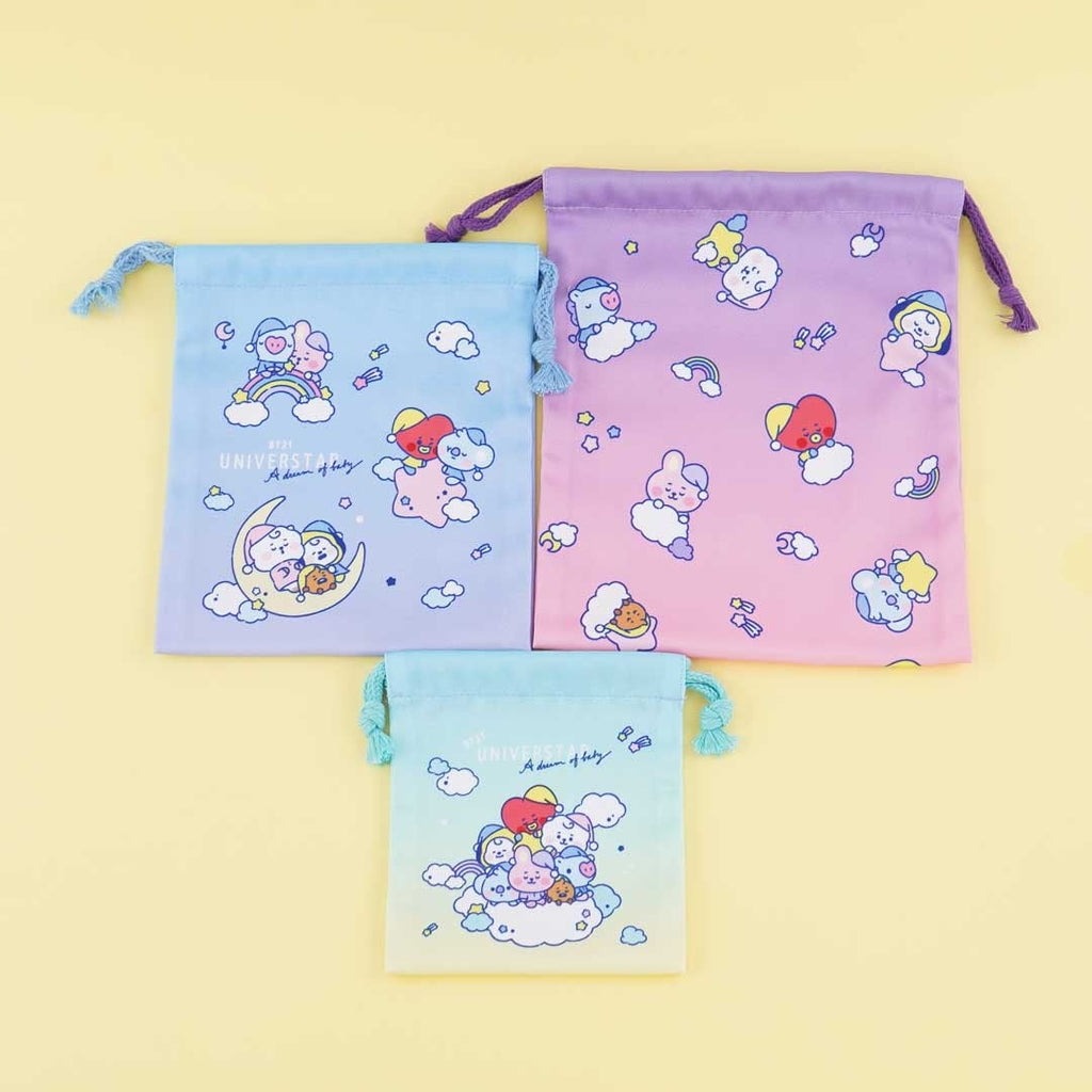 A set of kawaii drawstring pouches with illustrations of the BT21 baby characters sleeping together while in pajamas