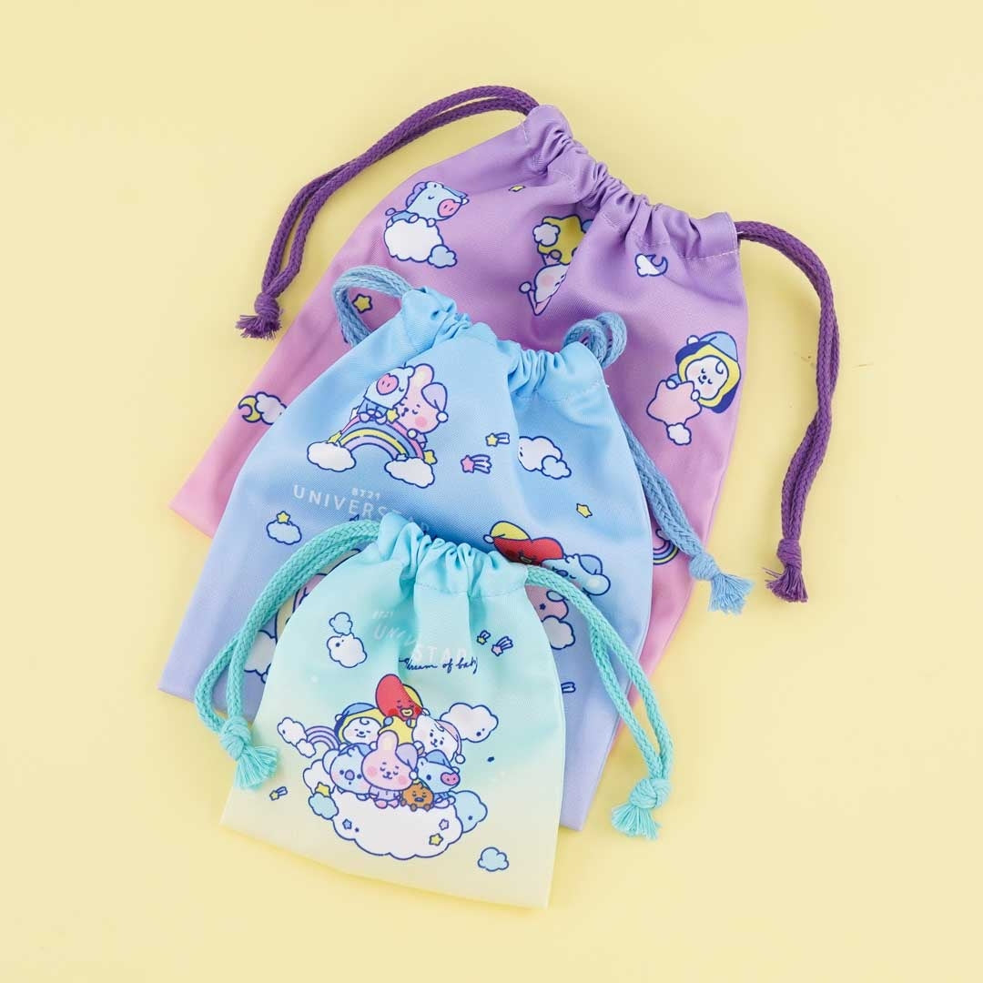 This super cute set of polyester pouches come in various sizes and are all decorated with prints of the BT21 baby characters in pajamas and sleeping soundly together! Use these drawstring bags to organize your favorite accessories. Simply pull the drawstrings to close each pouch.