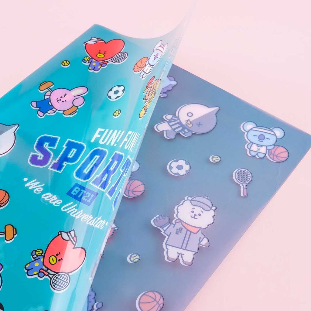 A semi-transparent A4 file folder with illustrations of BT21 characters playing sports