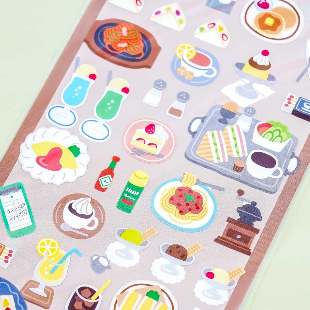 • A kawaii sheet of die-cut stickers featuring pritns of pastries and pasta from a cute cafe