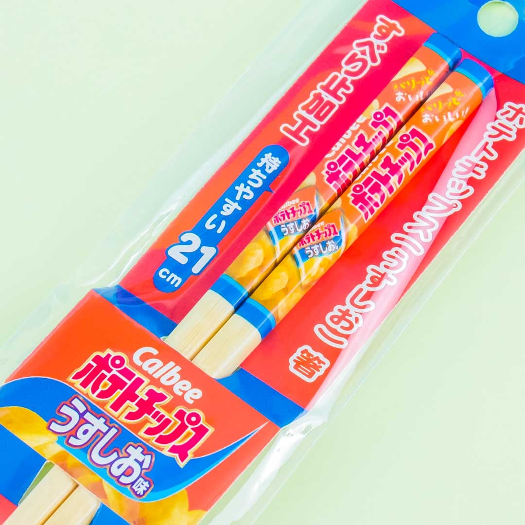 A kawaii pair of bamboo chopsticks resembling the packaging of Calbee Potato Chips Lightly Salted