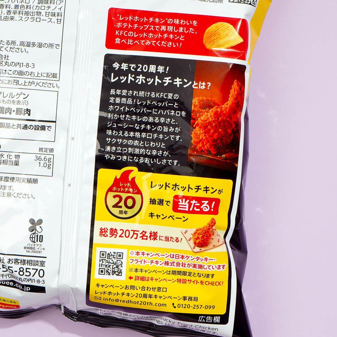 Enjoy the deliciously spicy flavor of KFC's Red Hot Chicken in this bag of jagged potato chips! This comes from a collaboration between Calbee Potato Chips and the famous fast food, KFC!