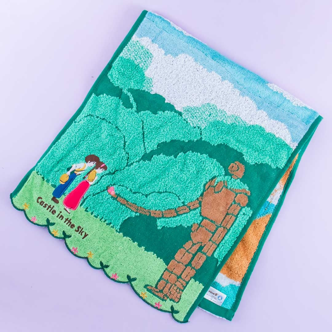 This super cute cotton towel features prints of characters from the Ghibli movie "Castle in the Sky" in a forest. Dry yourself off after a nice warm bath with this long towel!