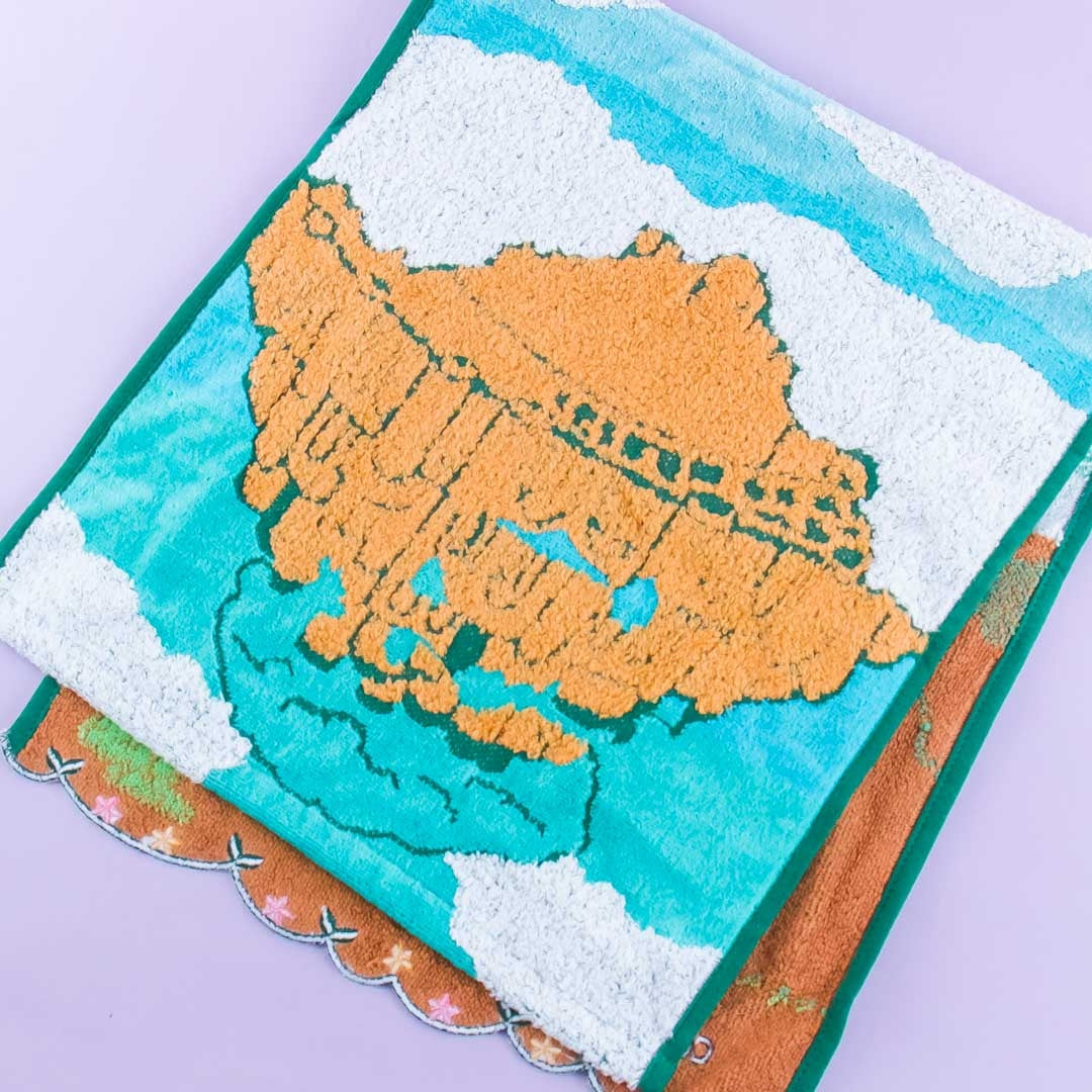 • A kawaii long towel covered in prints of Castle in the Sky characters in a forest