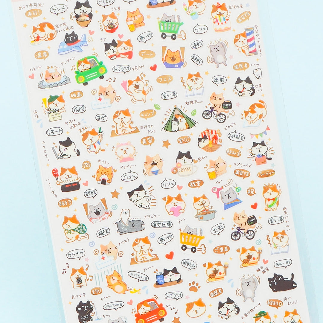 .Keep track of your schedule by placing these kawaii mini stickers on your journal! The sheet features different die-cut designs of cute cats doing various things like riding a bike, eating, camping, and more!