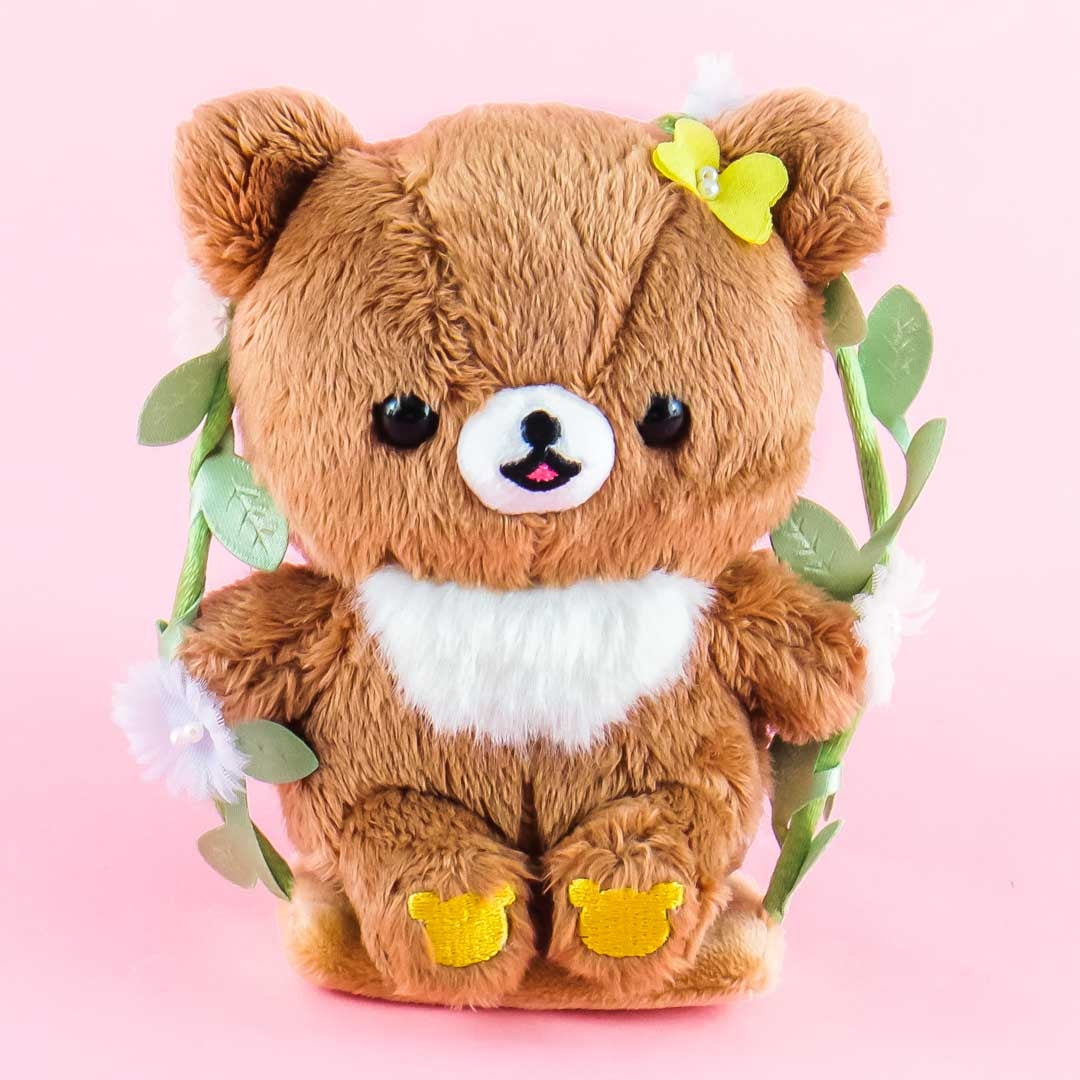 This super cute Chairokoguma character plushie is having fun while on a leafy swing set! Take it with you everywhere by hanging this mini-sized fluffy charm on your bag with its removable ball chain!