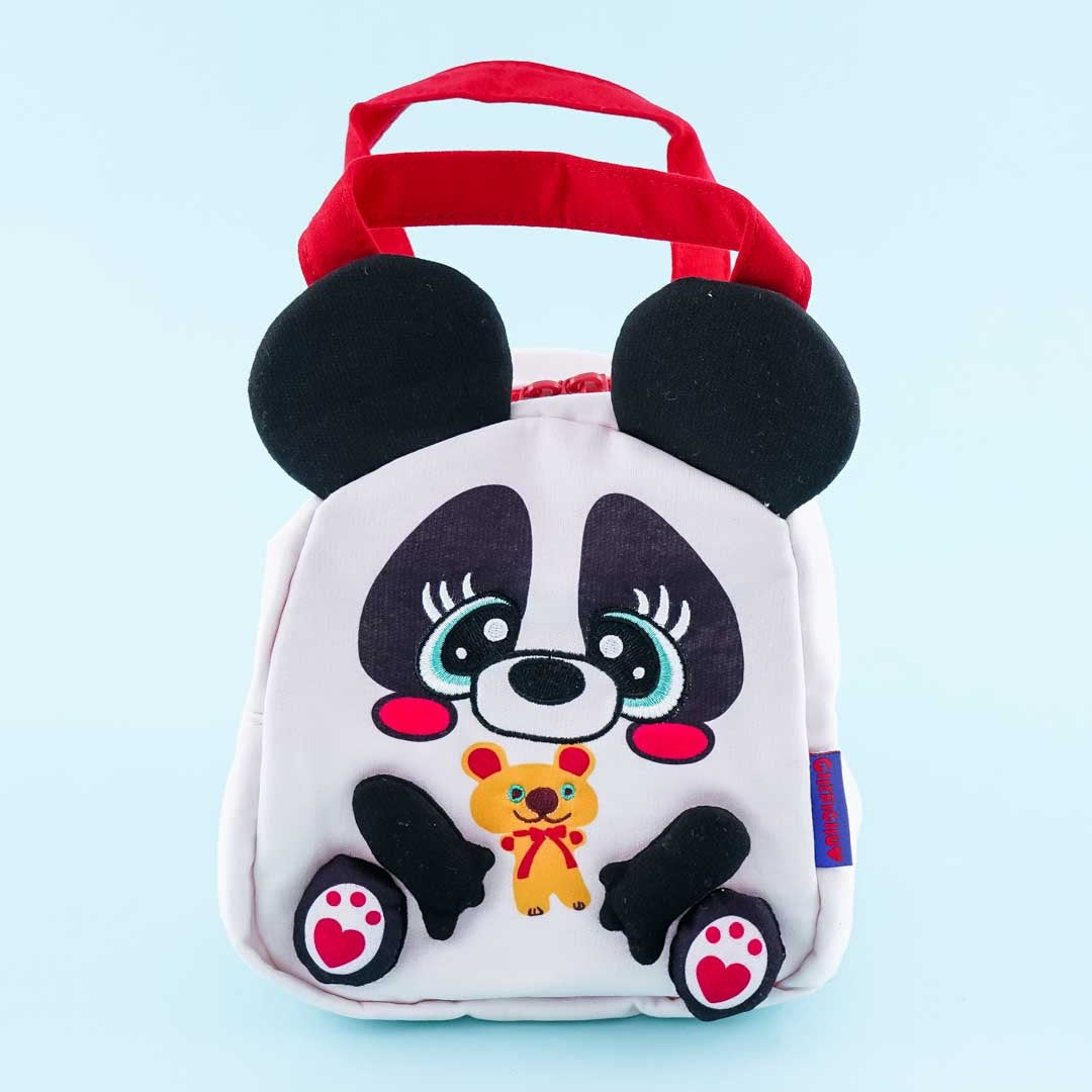 A cute die-cut lunch tote featuring a baby panda hugging a bear