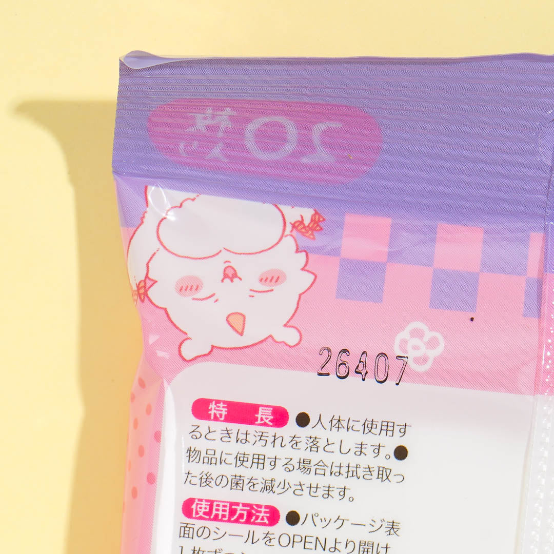 Stay clean and sanitized wherever you go when you bring this pack of wet wipes with you! It features cute Chiikawa characters on the compact packaging. These wet wipes are alcohol based and designed to disinfect hands and surfaces!