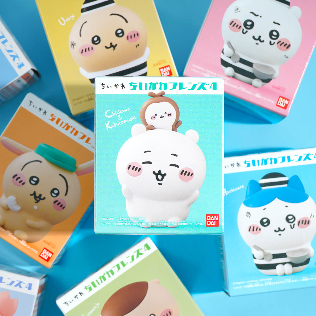 Have fun collecting all the soft vinyl figures from this fourth collection of the "Chiikawa Friends" series! It features palm-sized characters from the Chiikawa anime series and comes with a soda-flavored gum.