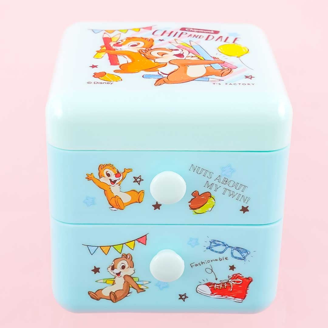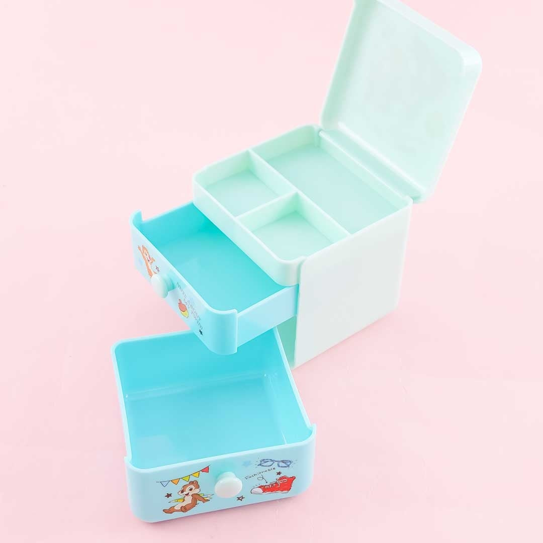 Use this super cute storage box to organize your jewelry, cosmetics, and other things. It showcases prints of Chip & Dale playing around! This storage box has two pull-out drawers and an upper partition with a flip-top lid for you to use.