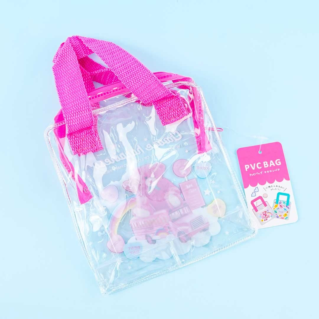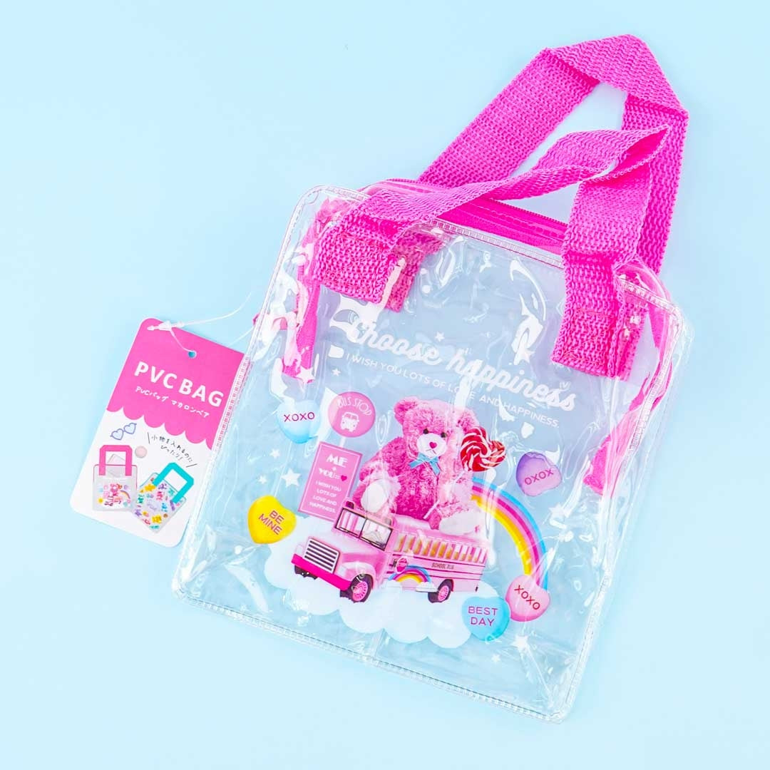 Use this super kawaii mini zippered handbag to carry your things! It's decorated with a print of a bear, bus, rainbow, and other cute items.