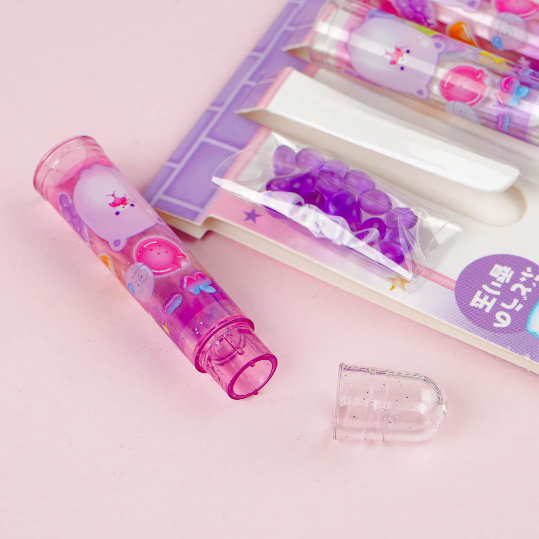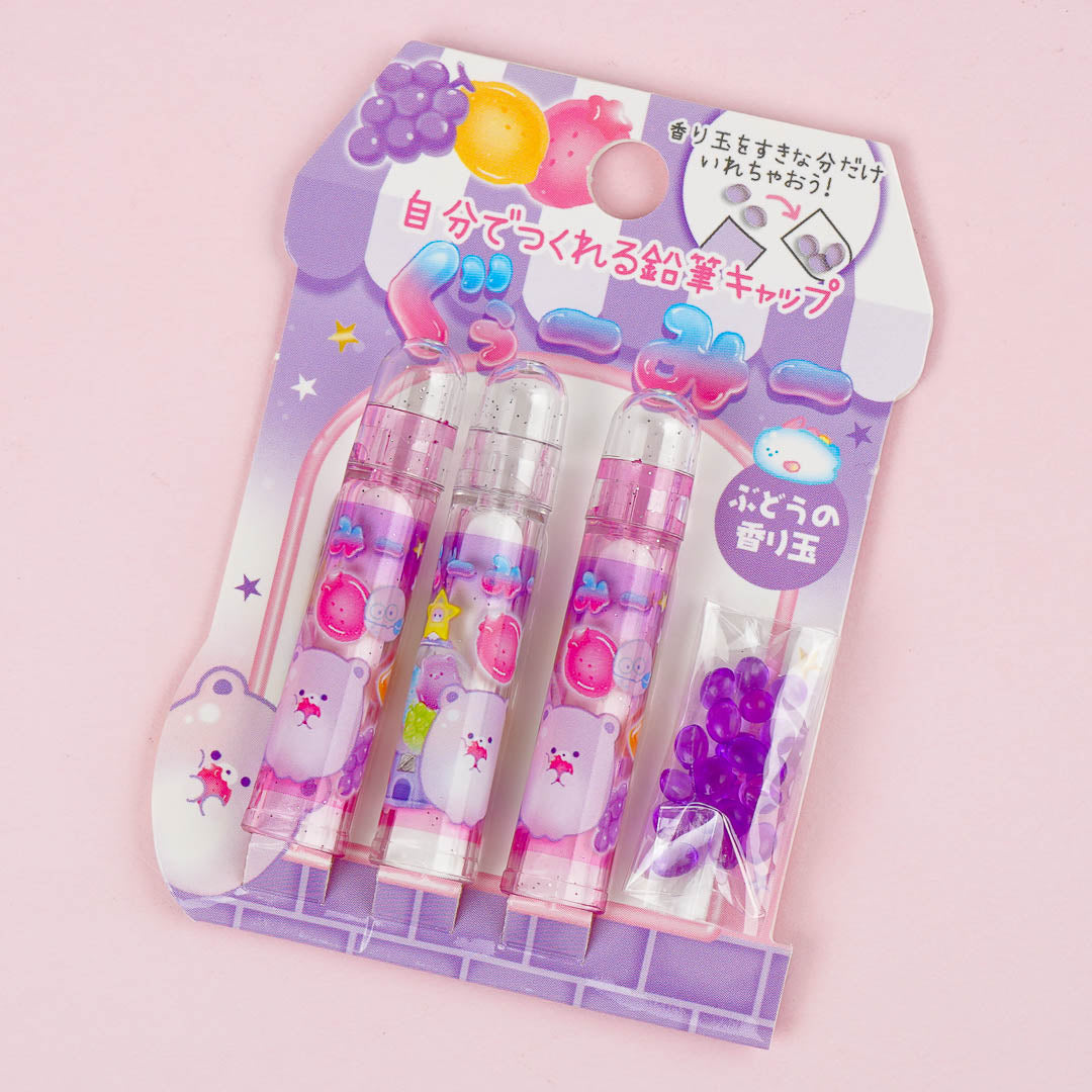 This kawaii pencil cap set comes with grape-scented fragrance balls you can add yourself! Each pencil cap features a cute illustration of a chubby bear eating some berries. Put the caps on your pencils and enjoy the fruity scent of grapes!