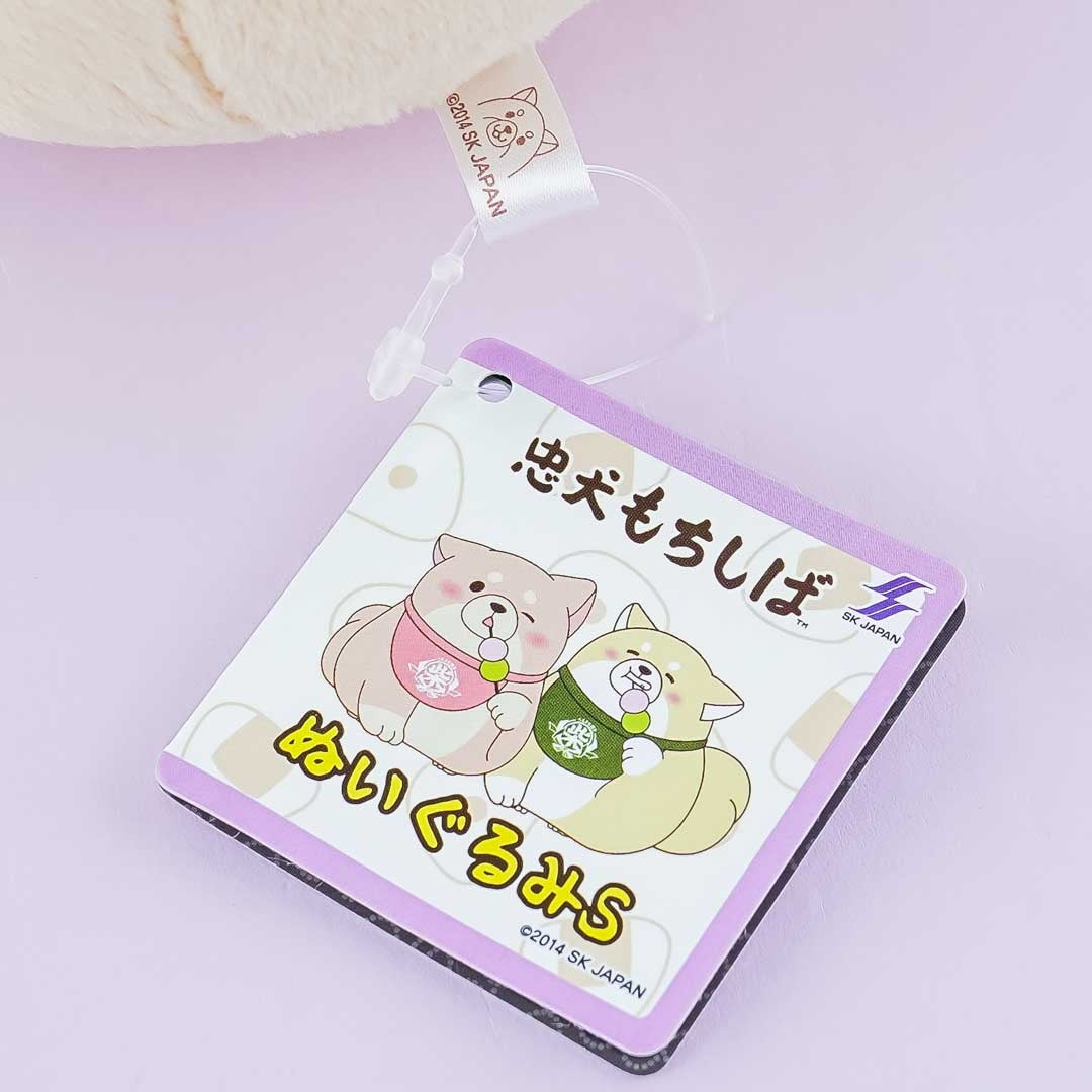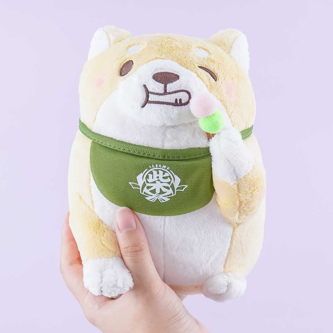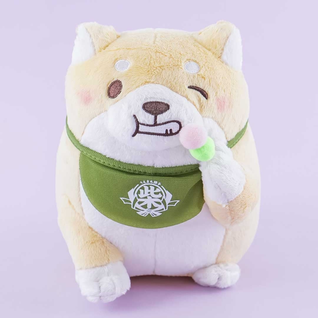 A super cute medium-sized Kinako plushie from the Chuken Mochi Shiba series eating kinako dango