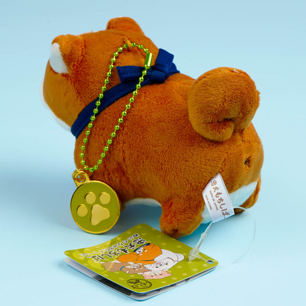 This mini Okaka plushie charm from Chuken Mochi Shiba is the perfect travel buddy. Attach it to your bag with its removable ball chain. It has an extra round-shaped charm with a paw print on it.