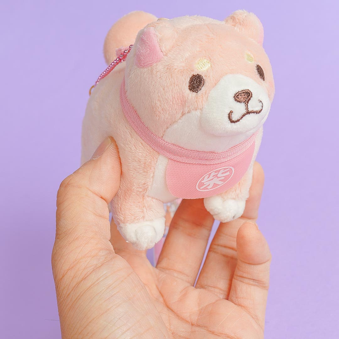 This kawaii medium-sized plushie features a cute design of Sakura from Chuken Mochi Shiba. You can attach it to your purse with a removable ball chain.