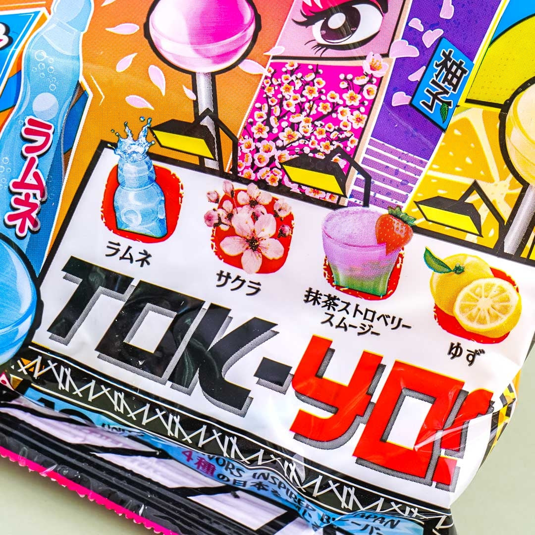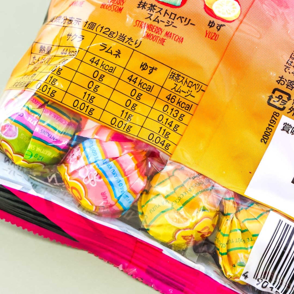 A pack of lollipops with Japanese inspired flavors like ramune, cherry blossom, yuzu, and strawberry matcha smoothie