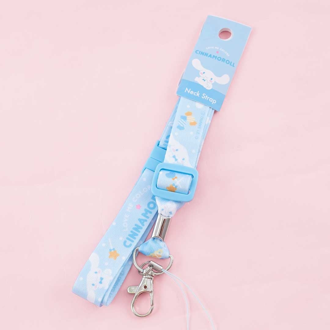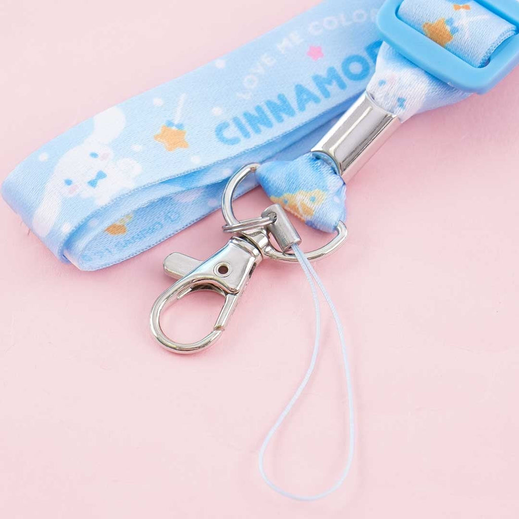 Use this super cute lanyard to display your ID cards. It has an adjustable strap, a metal clip, and a quick-release buckle. It is covered with prints of Cinnamoroll and comes with a string loop you can use to attach your favorite charm!