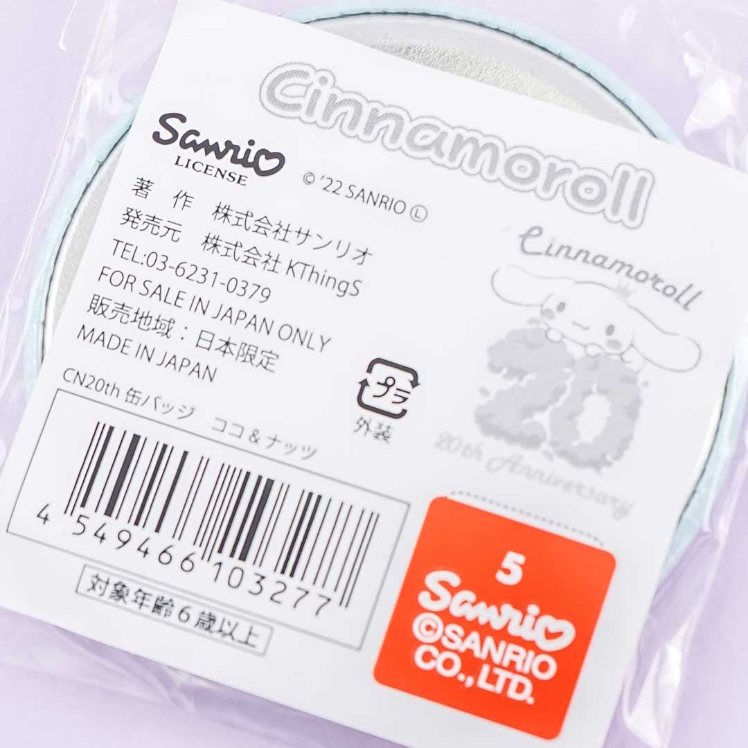 Join Coco and Nuts as they happily celebrate the 20th anniversary of Cinnamoroll! Simply pin this aluminum badge to your favorite denim jacket to complete your kawaii look.