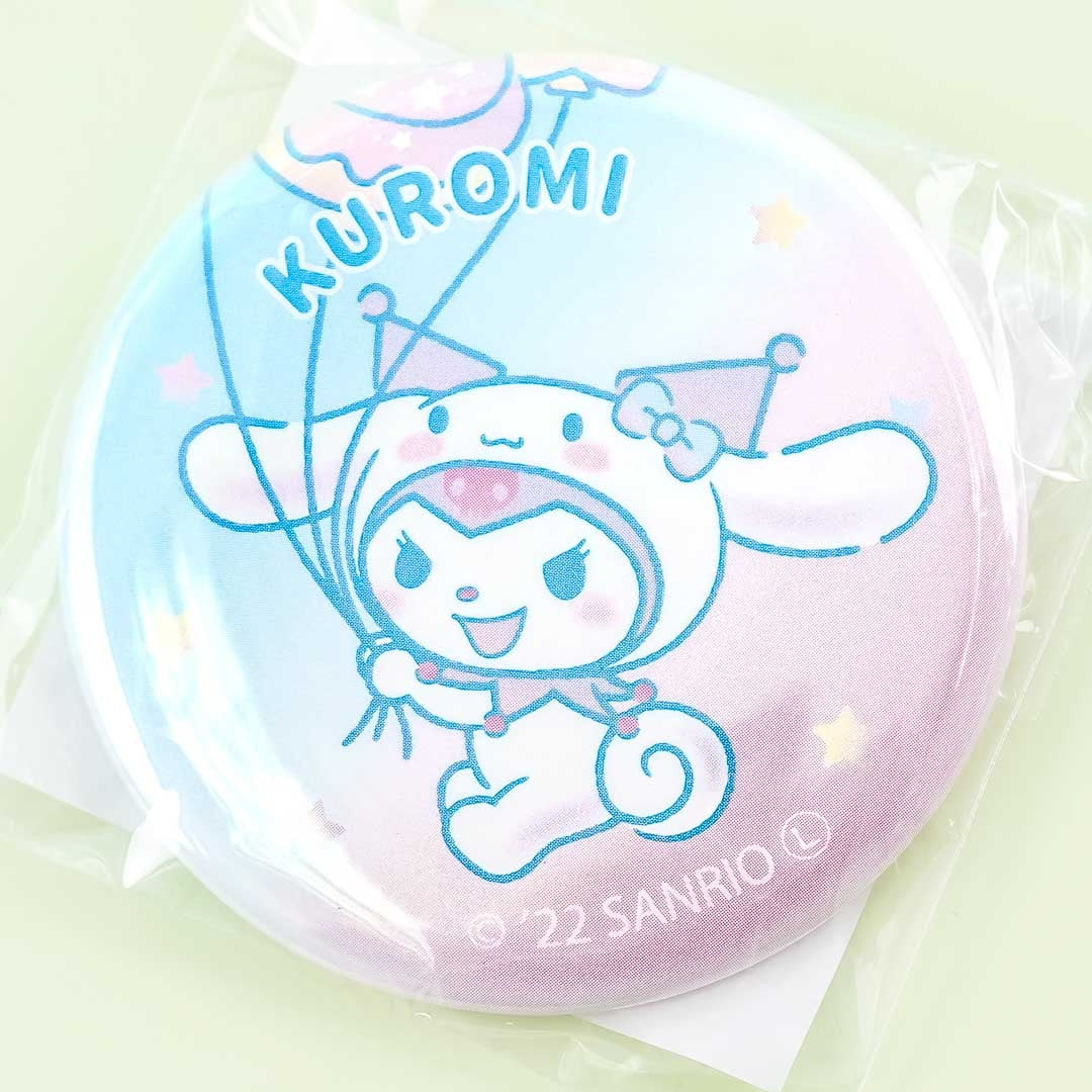 Jazz up your outfit with this super cute badge! It’s decorated with a print of Kuromi wearing a Cinnamoroll onesie and carrying balloons. This aluminum badge was designed in celebration of Cinnamoroll’s twentieth anniversary!