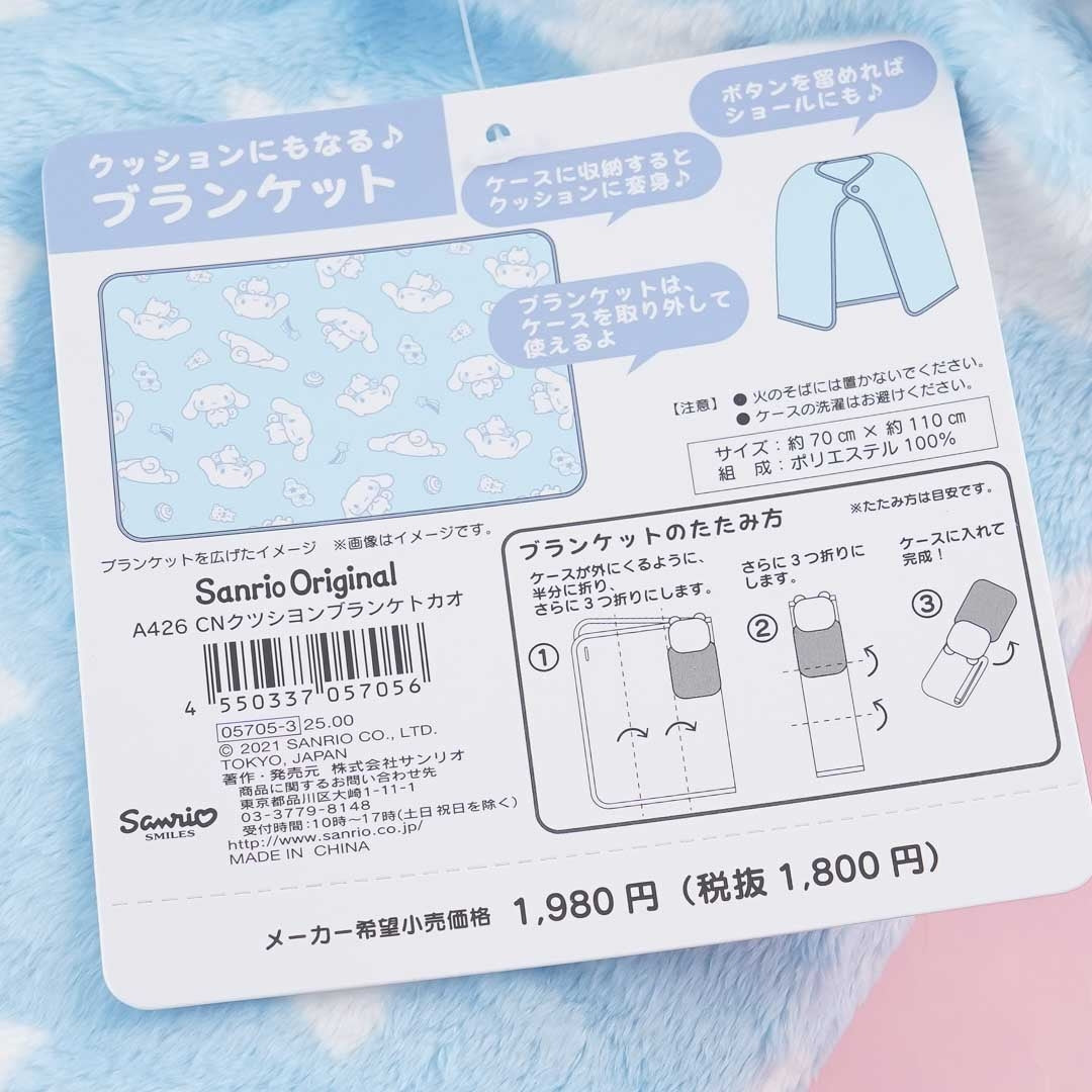 Take this kawaii Cinnamoroll multi-purpose cushion to a slumber party! By removing the plushie-like case, you can unfold it into a blanket! This super-soft-polyester cushion can also be used as a shawl as it also comes with a snap button.