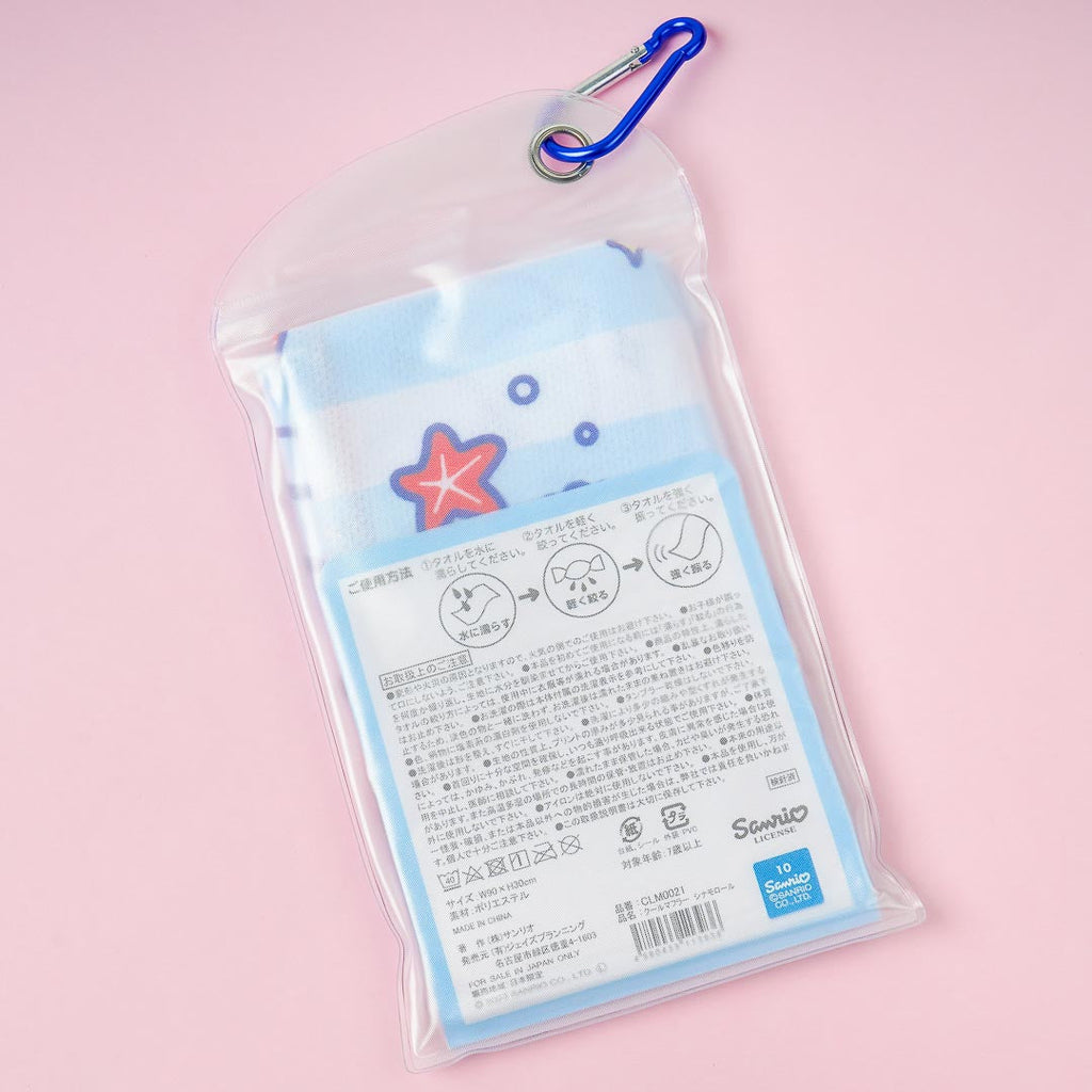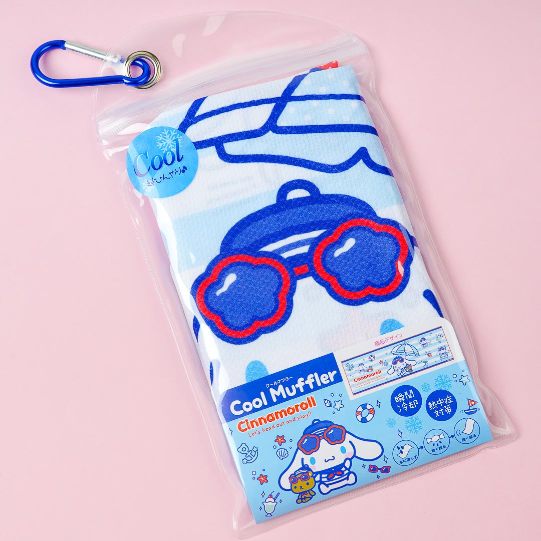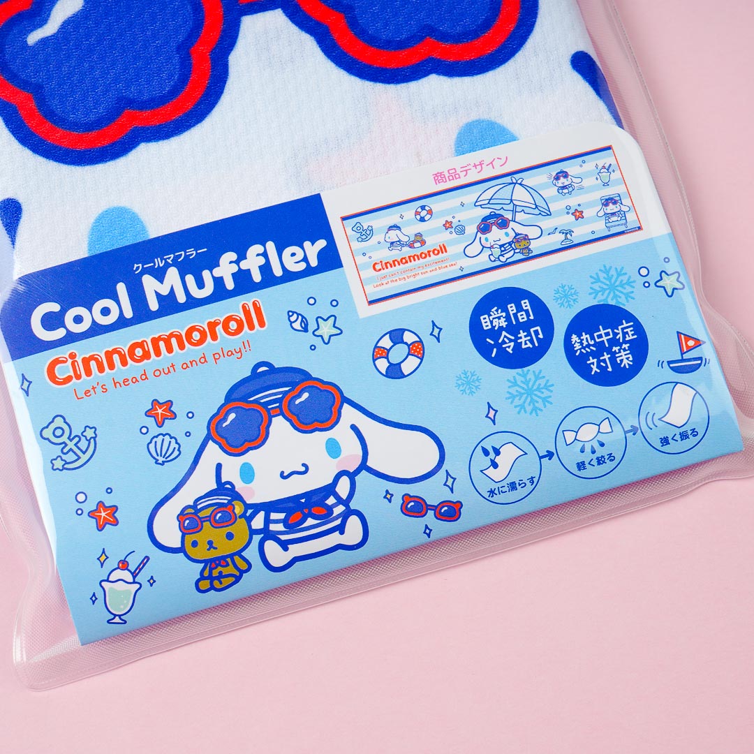 Enjoy summer activities while staying cool with this cute cooling muffler. It's decorated with kawaii Cinnamoroll having fun at the beach. Simply wet, wring, and shake the towel before you put it around your neck.