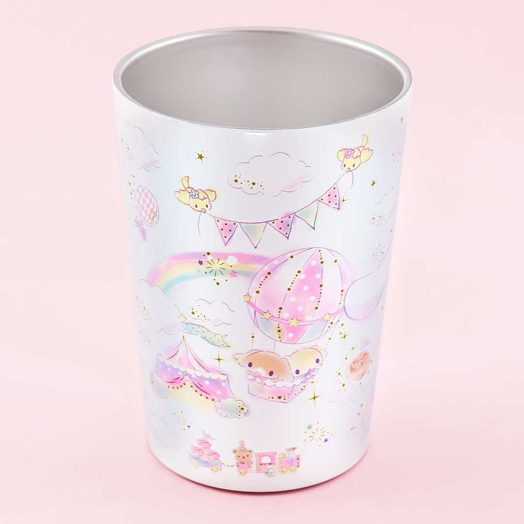 A super cute stainless steel tumbler illustrated with Cinnamoroll at a carnival