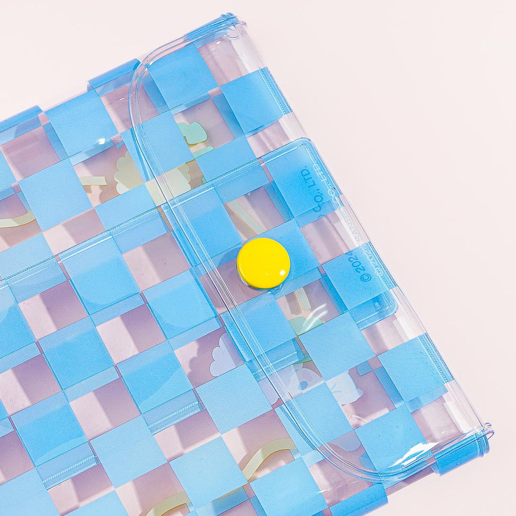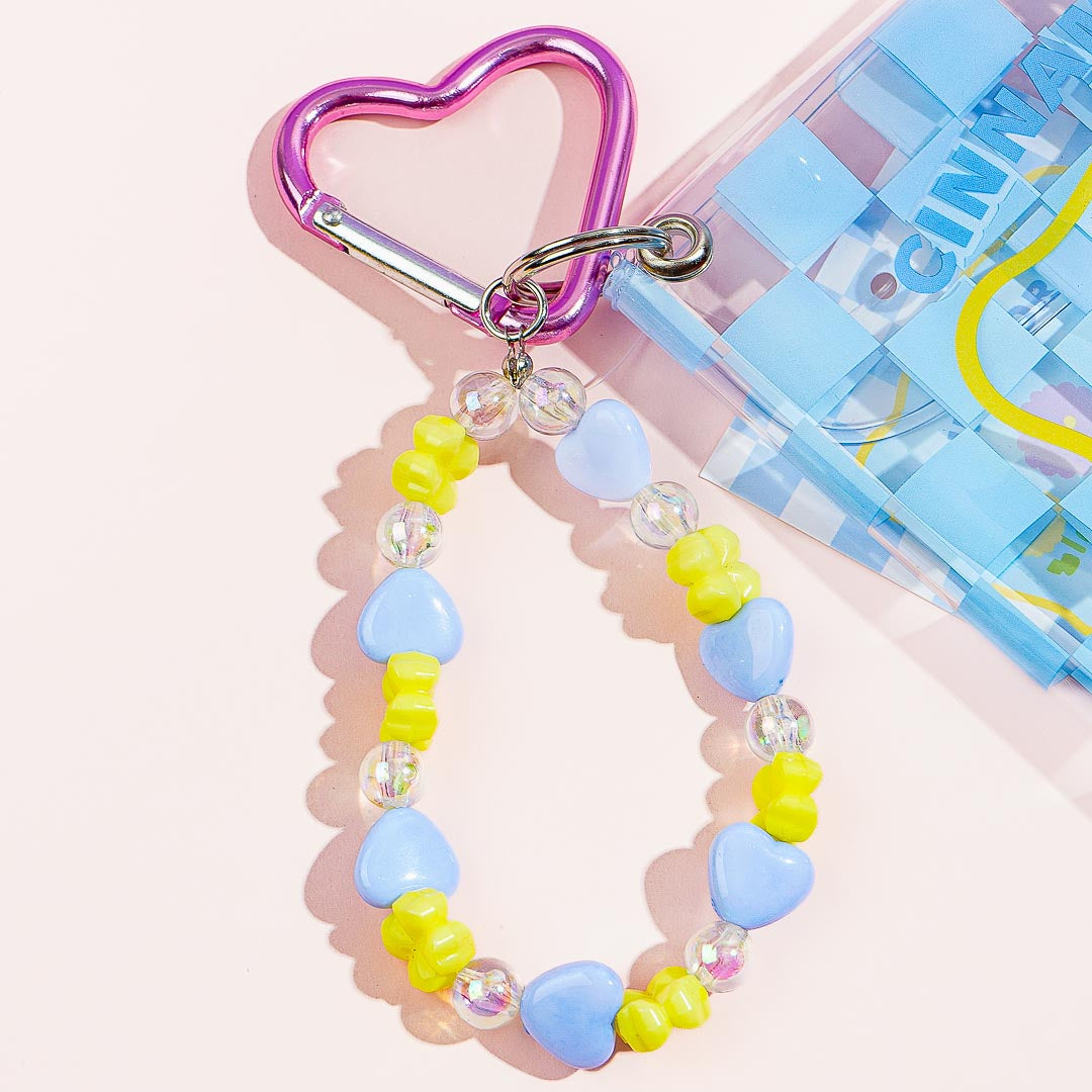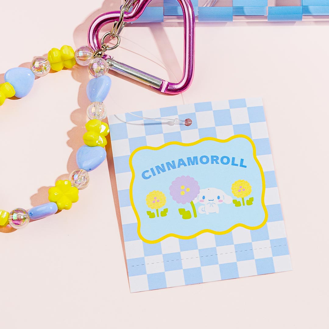 This cute clear pouch is decorated with blue checkered patterns and a kawaii illustration of Cinnamoroll harvesting large flowers! It also comes with a special bracelet-like charm made from pastel beads. Use this pouch to store your mints and coins!