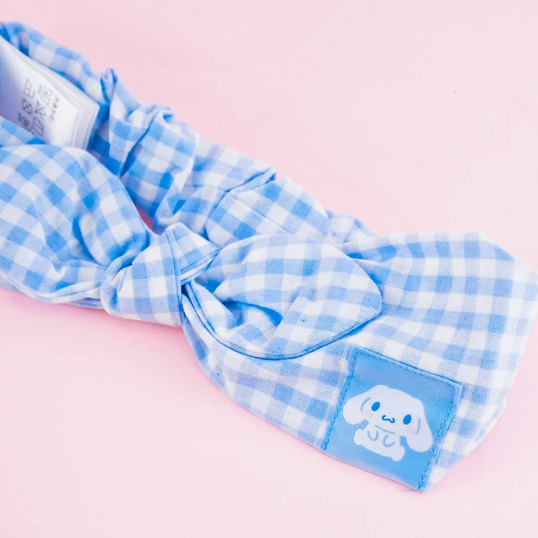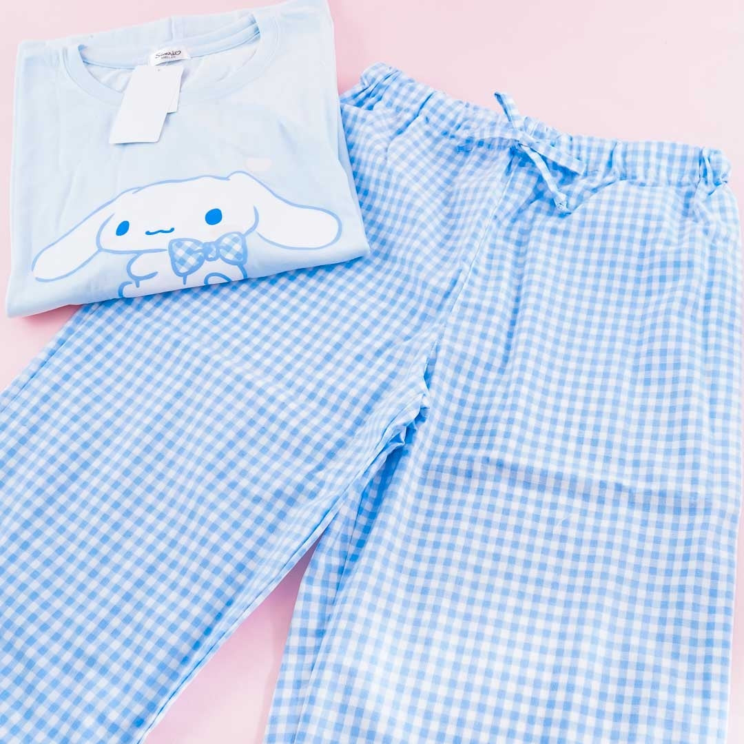 Don't forget to wear this super cute pajama set before going to bed! It includes a loose shirt featuring a print of Cinnamoroll, a pair of ankle-length checkered long pants, and a checkered cloth headband. This set of pajamas is made with comfortable tenjiku cotton.