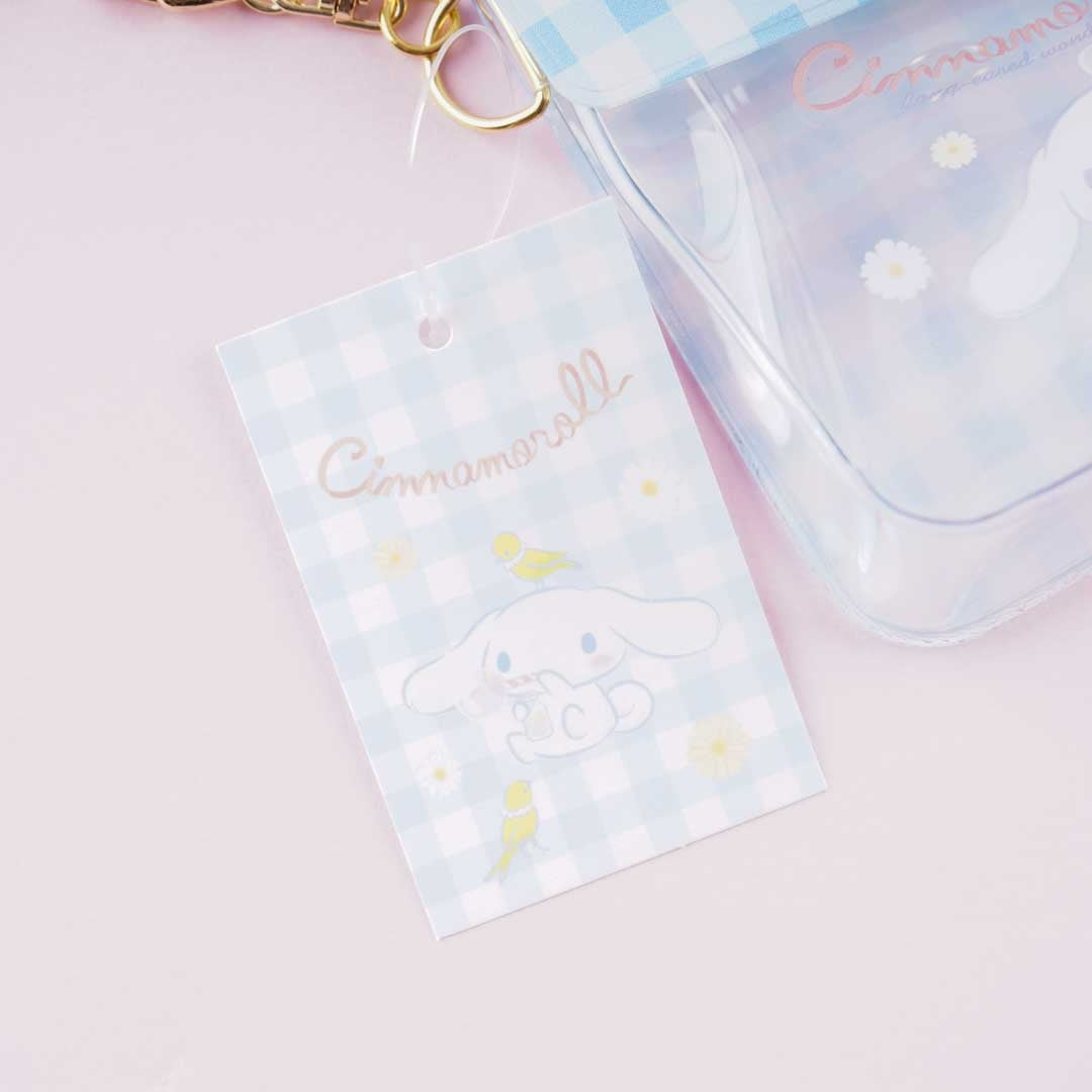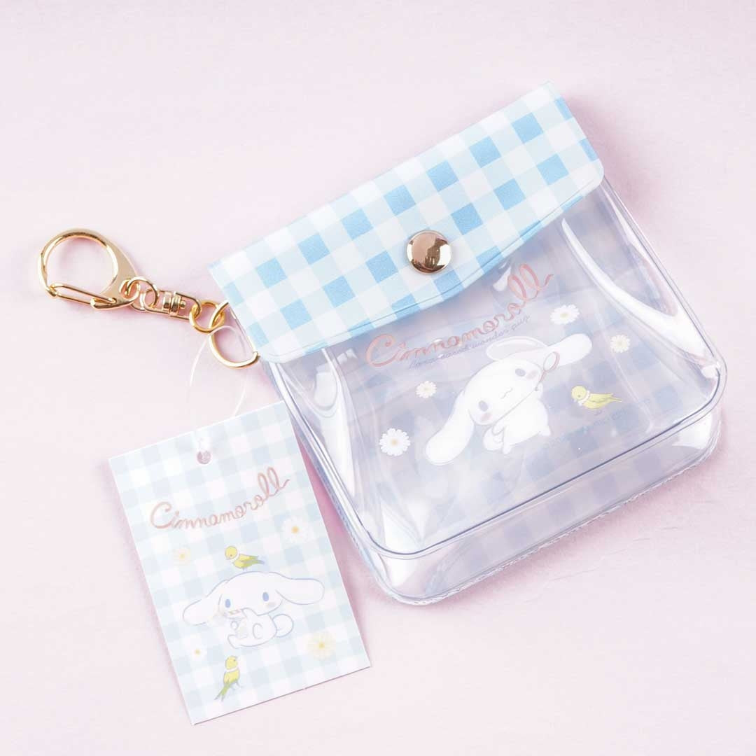 Use this cute clear mini pouch to store your knick-knacks! It showcases a print of Cinnamoroll with daisies. This pouch has a button closure and a hook with a metal chain for you to use.