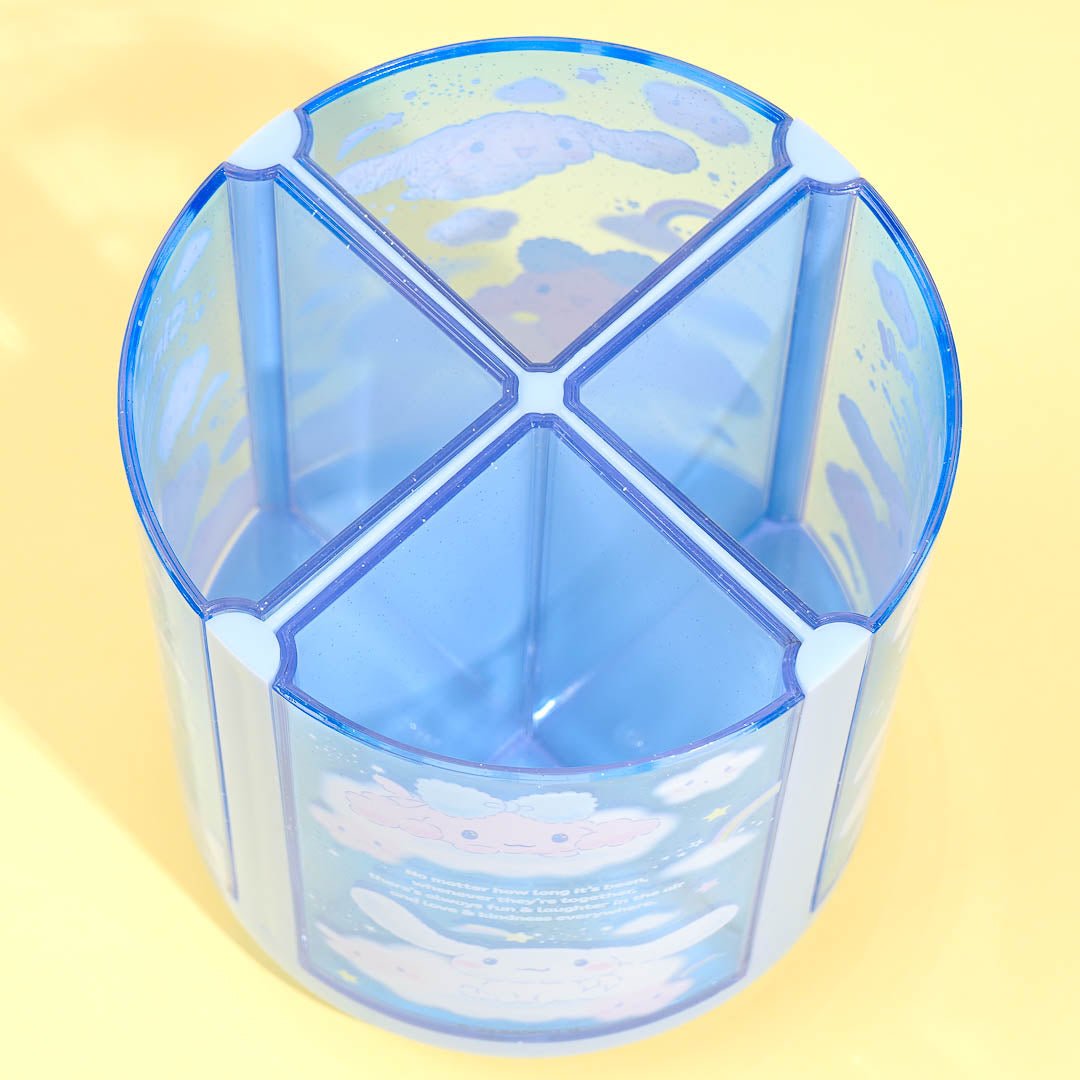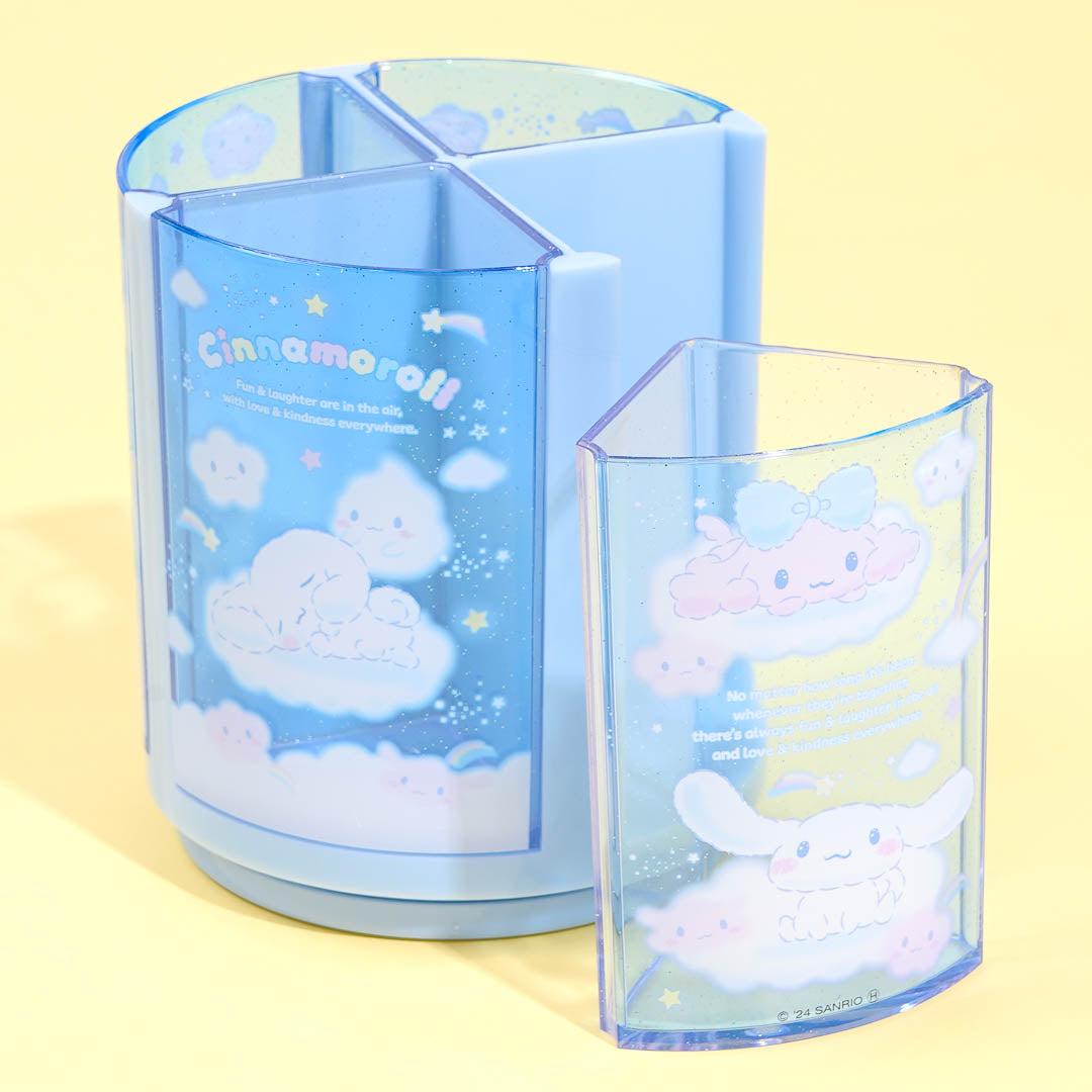 Organize your writing and craft tools using this super cute pen stand! It features illustrations of Cinnamoroll having fun with his friends on the clouds. This organizer has a rotating base and four removable compartments so you can easily use it!