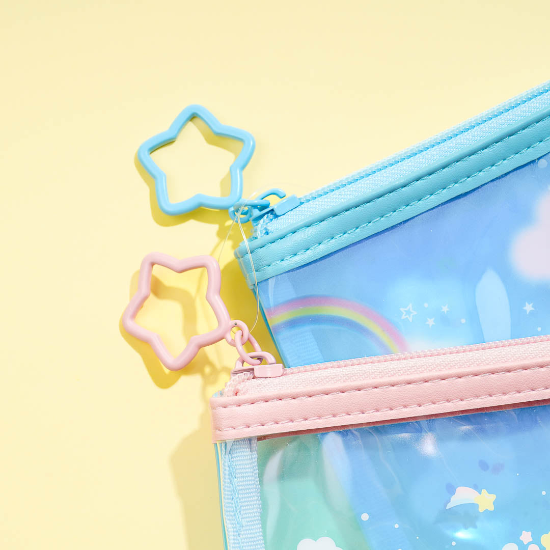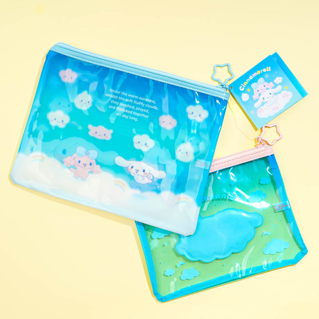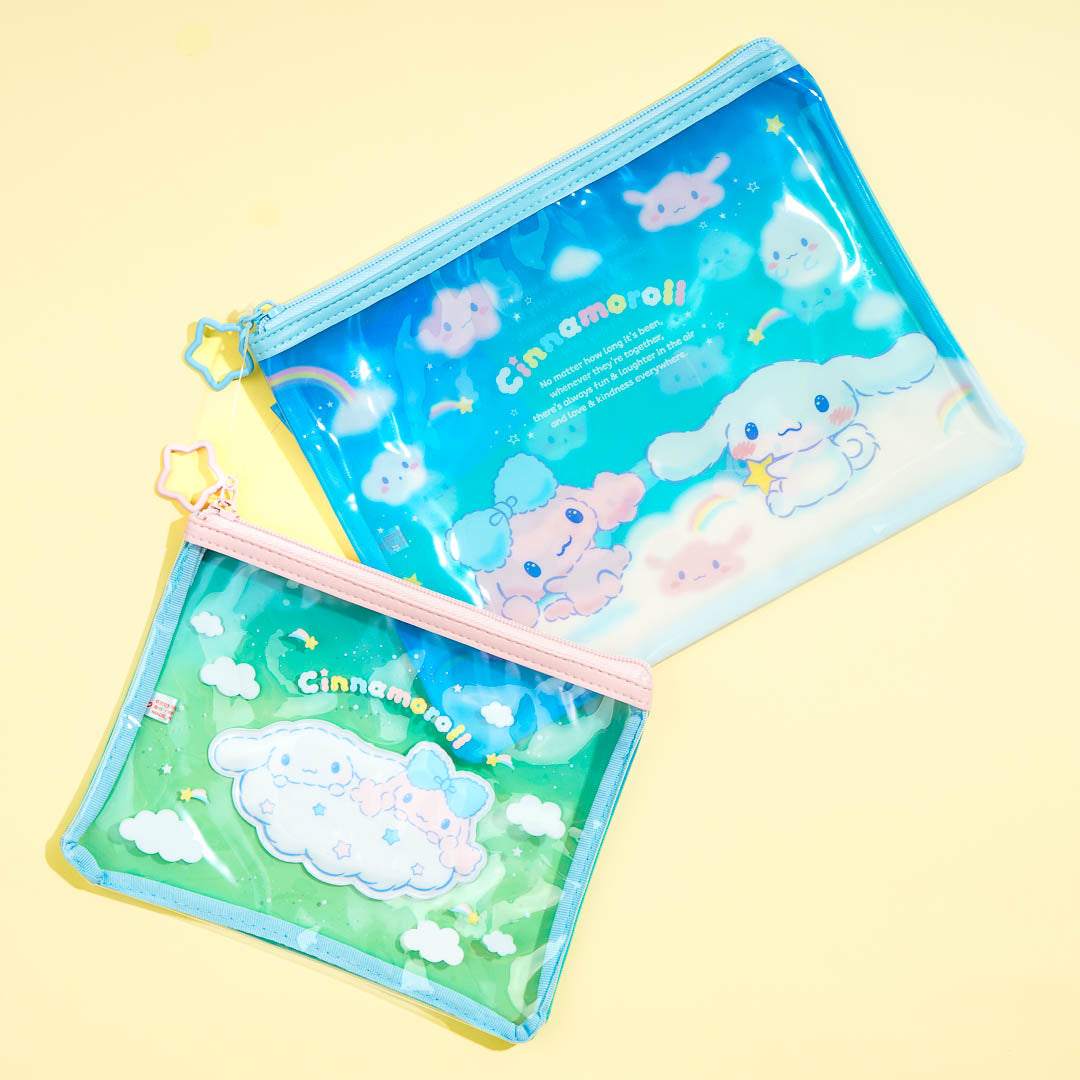 Use this super kawaii set of flat pouches to keep your cosmetics or your stationery items. They feature prints of Cinamoroll hanging out with his buddies among the clouds! Each zippered pouch has a cute star-shaped charm.