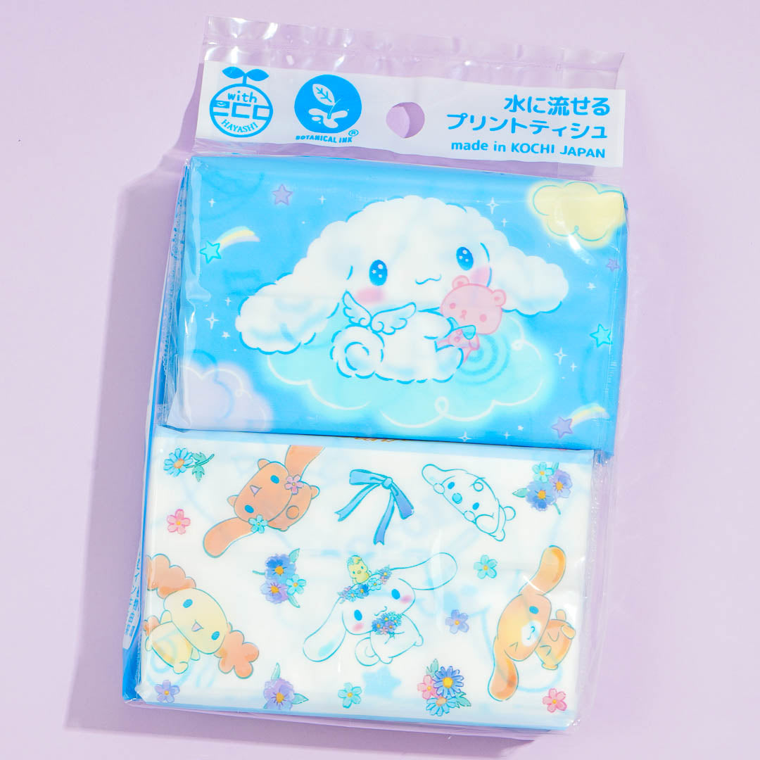 Stay prepared when you travel by bringing this pocket tissue! The cute packaging is decorated with prints of Cinnamoroll and his friends on a cloudy sky. Each ply is made of soft, high-quality, flushable material.