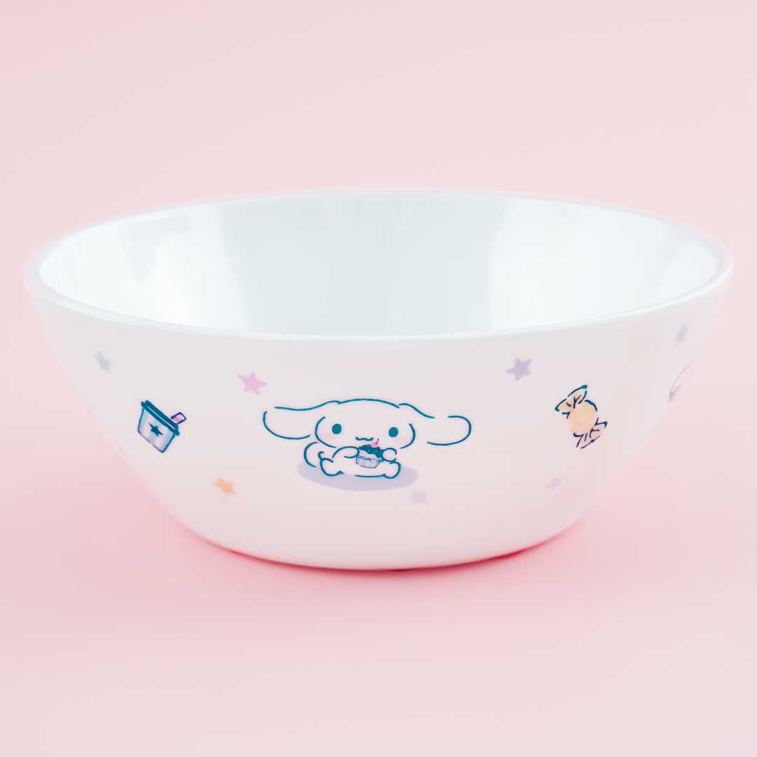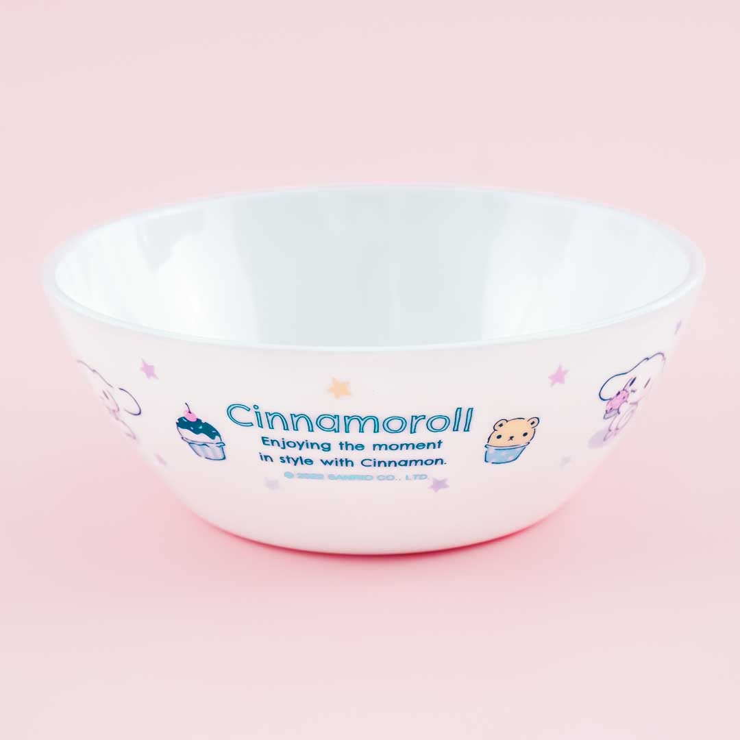 A melamine bowl showcasing Cinnamoroll enjoying dessert