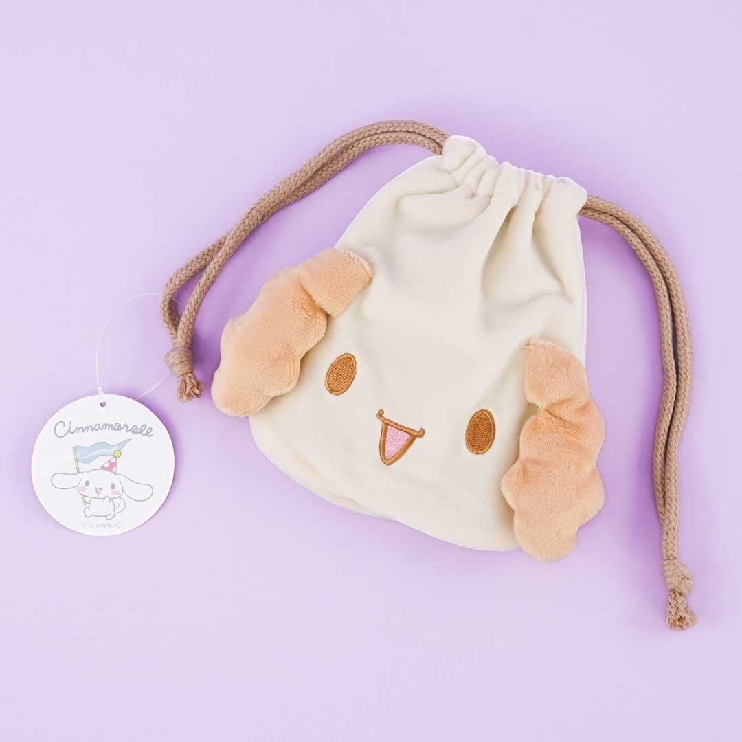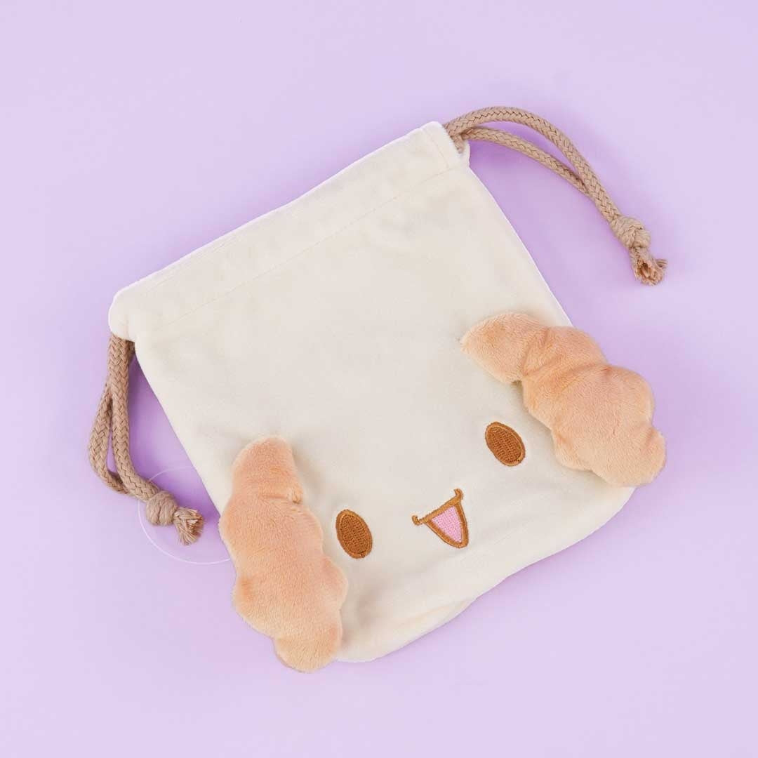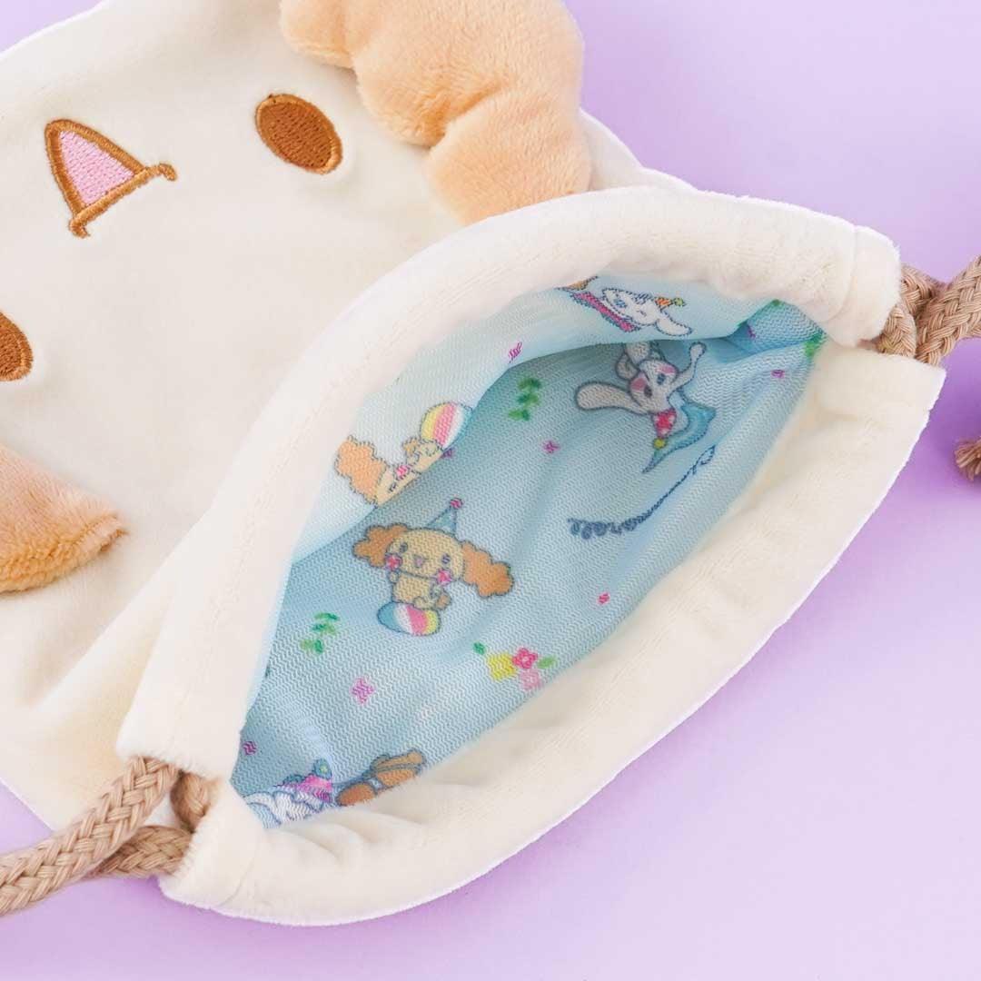 A kawaii drawstring pouch resembling Cinnamoroll's friend, Chiffon with 3D ears