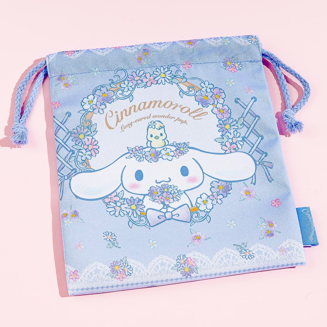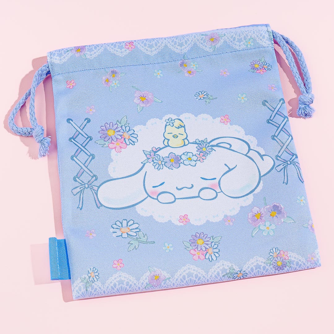 Use this kawaii drawstring pouch to store your cosmetics. It's illustrated with Cinnamoroll bringing flowers while wearing a flower crown on his head! Just pull the strings to close the pouch.