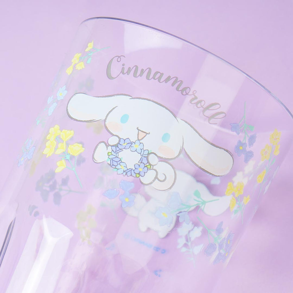 Make a cold and yummy drink with this kawaii transparent cup! It features a cute print of Cinnamoroll holding a flower wreath with tons of bouquets in the background. Not recommended for microwave and dishwasher use.