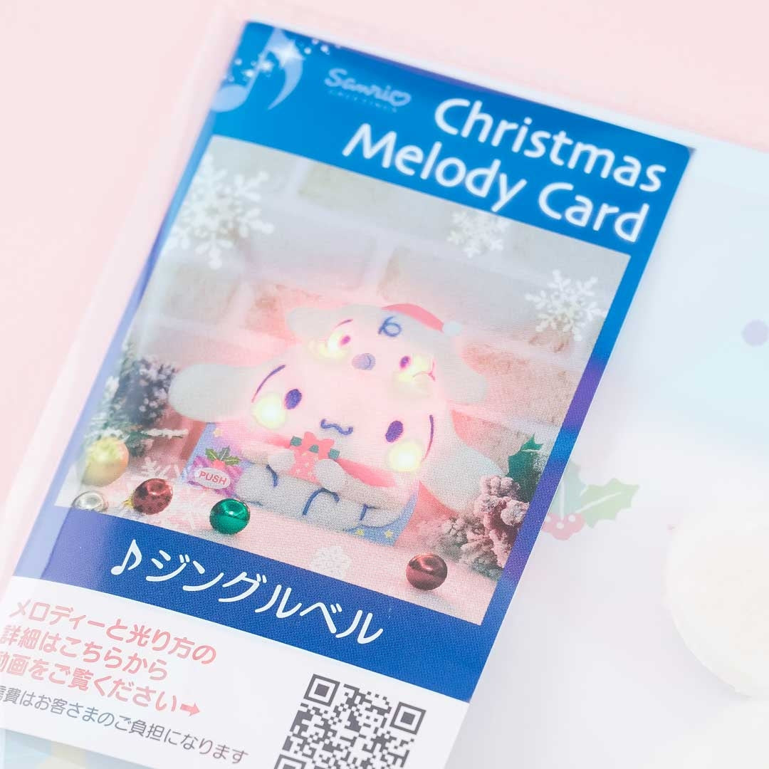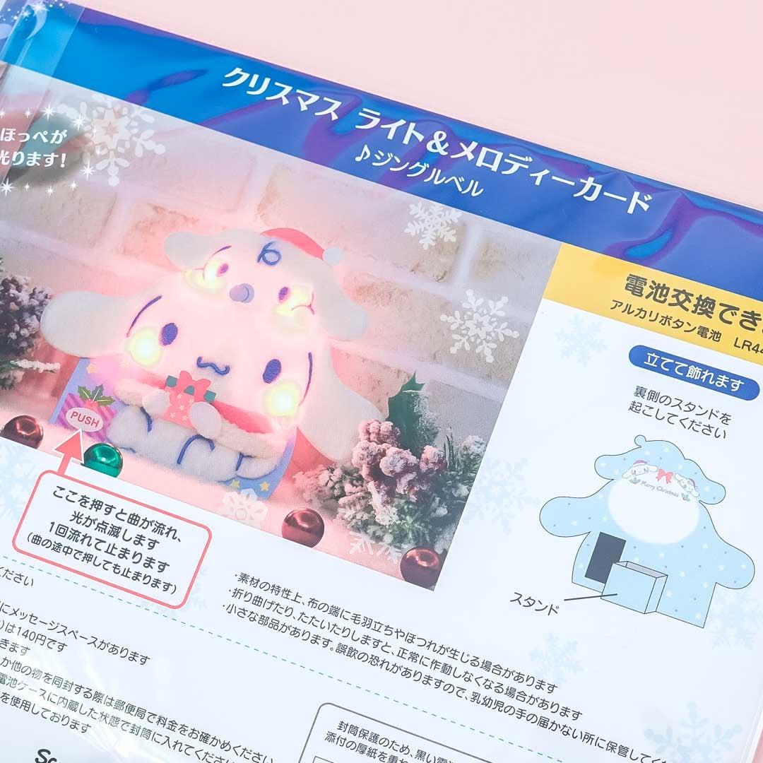 This super kawaii fluffy Christmas card features a print of Cinnamoroll dressed up for the holidays. It can light up and play the song "Jingle Bells." Send it to your family with its free envelope!