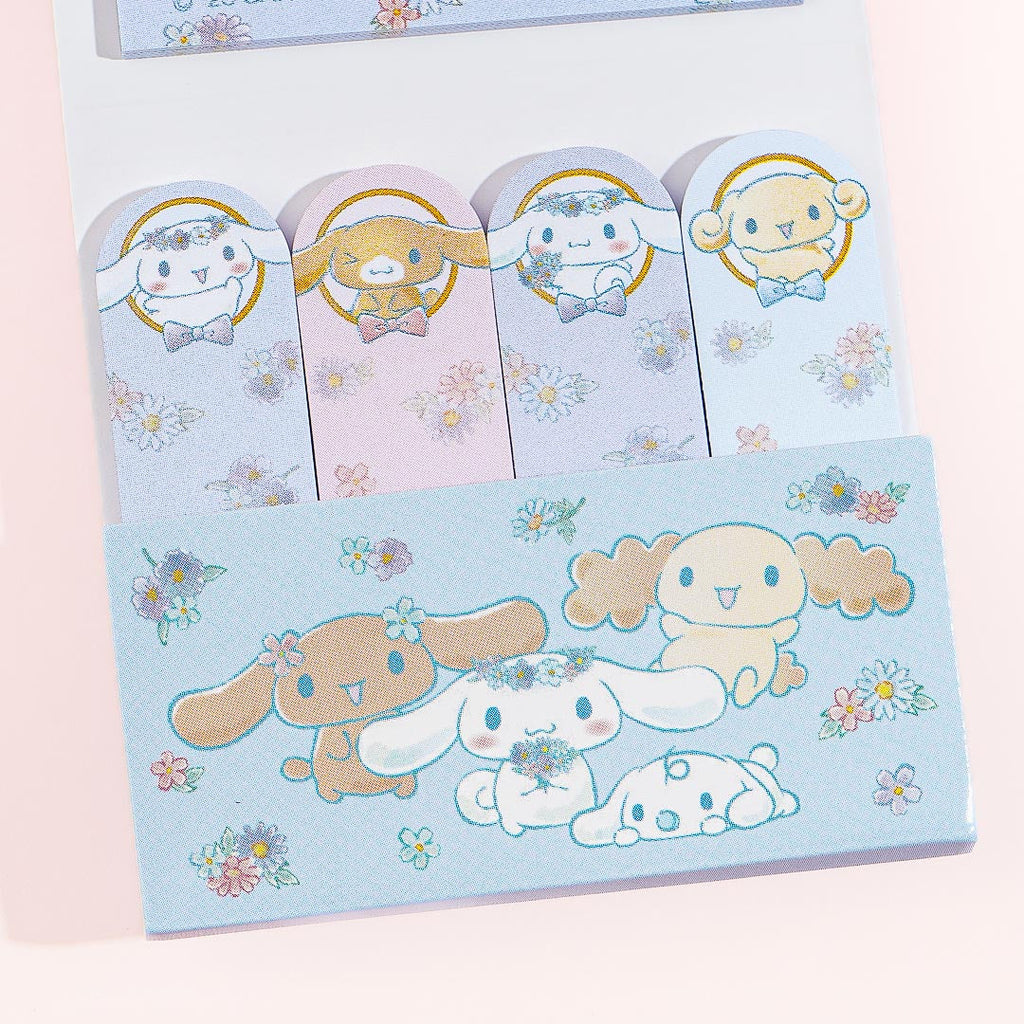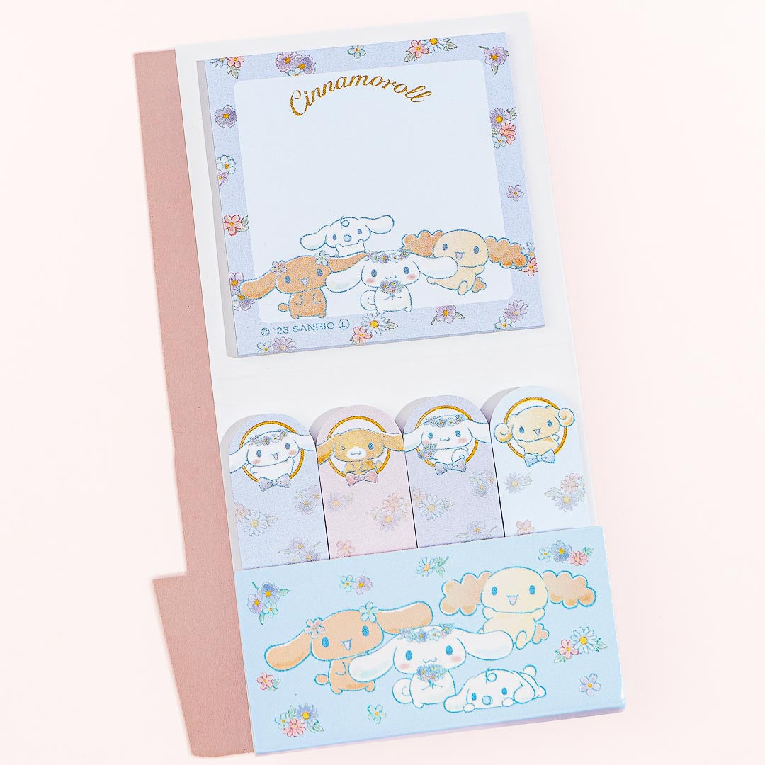 Mark important pages on your textbook by using these sticky notes! Both the square-shaped and tab-shaped sheets are decorated with kawaii prints of Cinnamoroll and friends surrounded by lovely spring flowers.