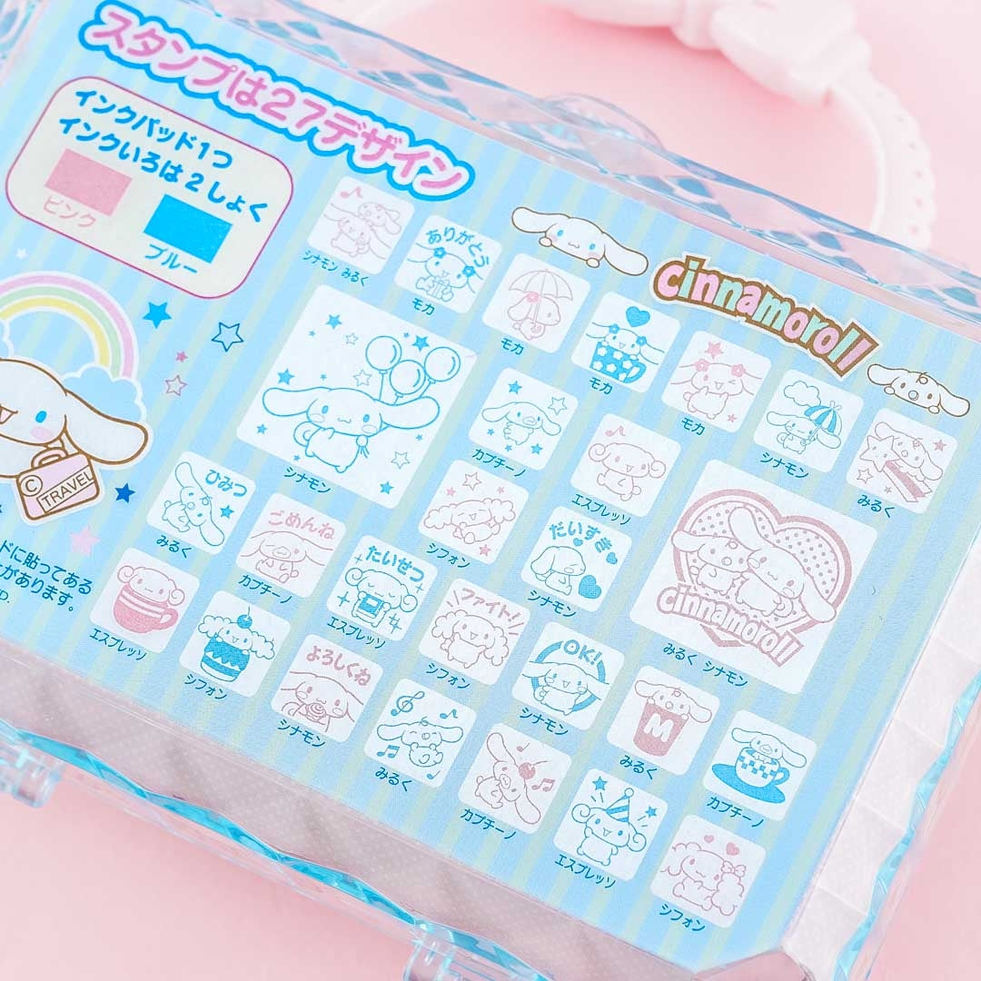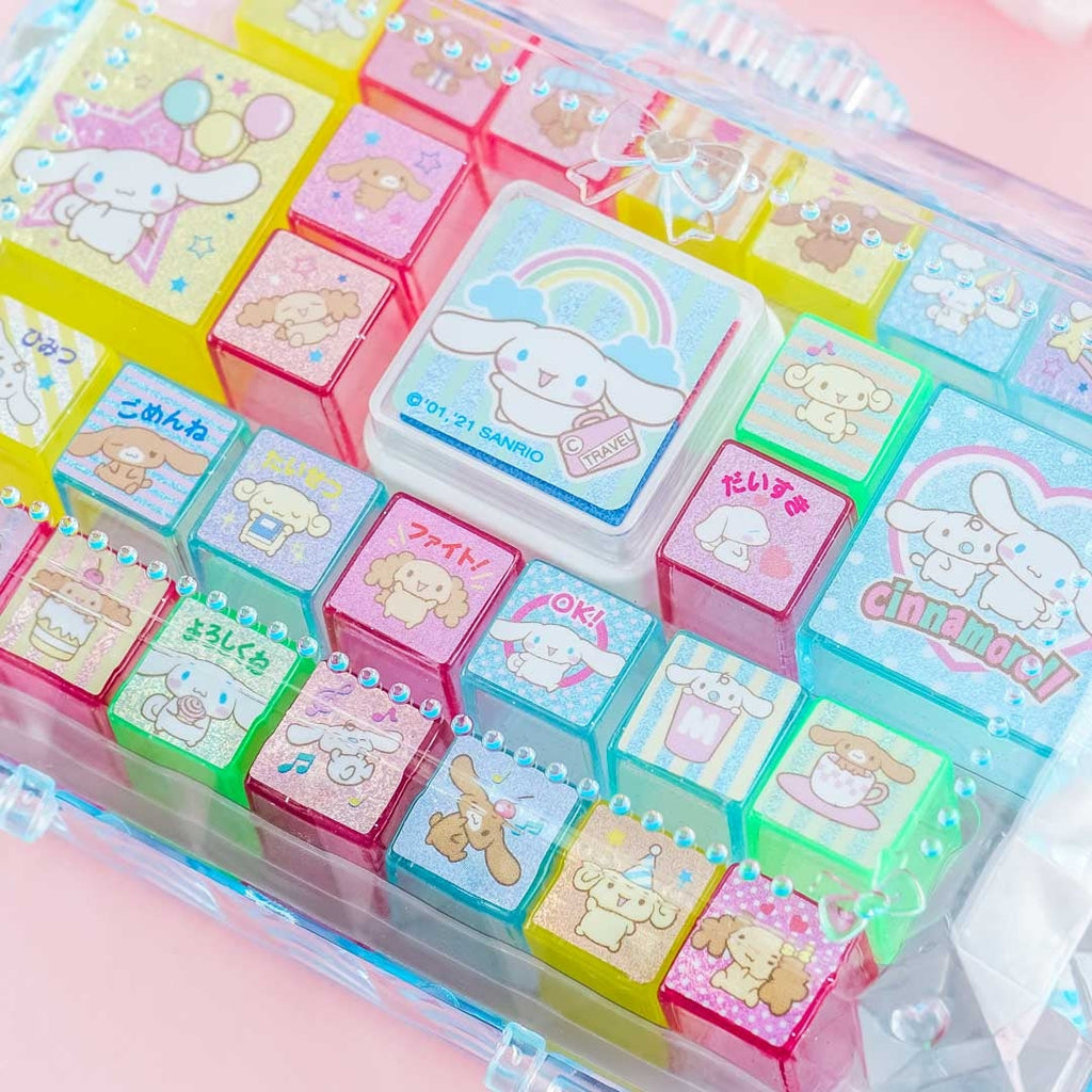 Use this super kawaii stamp set to embellish the letters you send to your friends! It features prints of Cinnamoroll and his friends playing around with one another. There are 27 stamps for you to use, an ink pad with blue and pink ink, and a glittery carrying case! Each stamp has glittery details.
